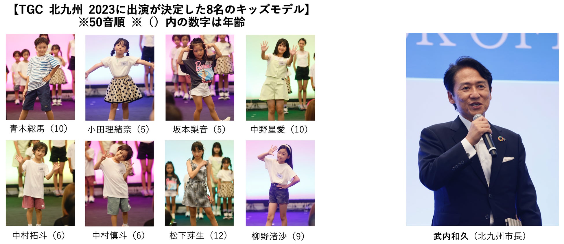 会場が暖かい空気に包まれる中、「応援してくれて、本当にありがとうございました。笑顔でTGCに出ます!」など、合格を喜ぶキッズモデルたちに、なこなこカップルより「TGCは毎回本当に緊張するので、こんなに小さな子たちが頑張っているのを見て、自分たちも頑張らなきゃと思いました!ランウェイは緊張しながらも楽しかった思い出ばかりなので、皆も頑張ってください!(なごみ)」「可愛すぎて、子供の運動会を見ているような気持ちになりました。自分の子供ができたらTGC北九州のオーディションに出します!(笑)僕はいつも、ランウェイもなごみに任せていて、2人で歩いているので心強いのですが、皆今日は1人でポーズを決めて、すごく堂々としていて、刺激をもらいました。これからが本番で、TGCのランウェイはもっと長いので、これからたくさん練習して、存分に楽しんで欲しいですね。おめでとう。(こーくん)」と応援メッセージが送られました。さらに武内和久 北九州市長も駆けつけ「本日、最終合格者に選ばれた皆様、おめでとうございます。私も娘が6歳なのですが、皆さんの堂々たる姿に非常に驚きました。TGC 北九州 2023のステージでの、素晴らしいパフォーマンスを楽しみにしたいと思います。頑張ってください!残念ながら本日選ばれなかった皆様も、次の機会に輝かれることを期待しています。TGC北九州を皮切りに、北九州、ますます熱く盛り上げていけたらと思います!」とコメントし、地元・福岡のキッズたちが、夢の舞台への切符を掴む瞬間を見届けました。