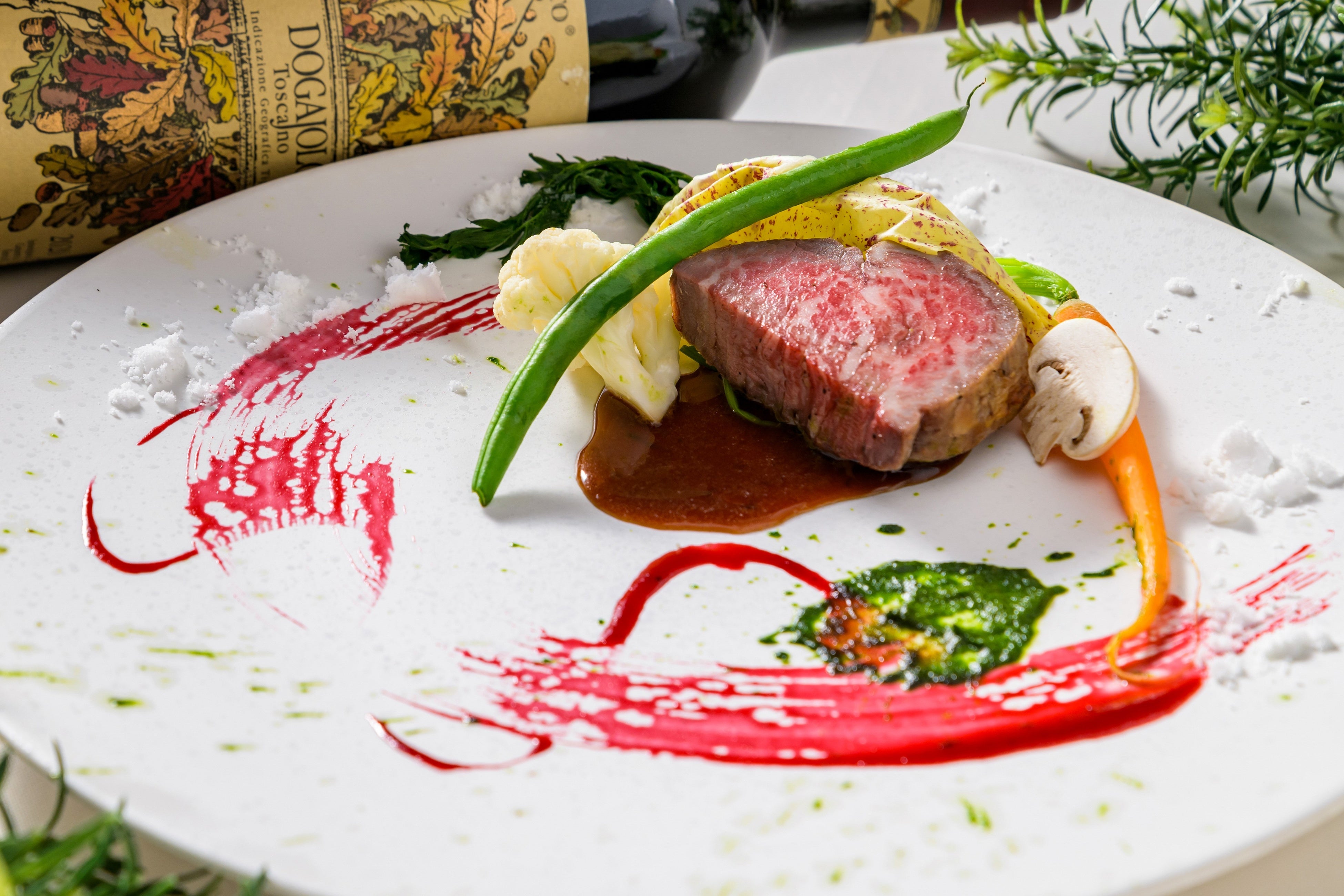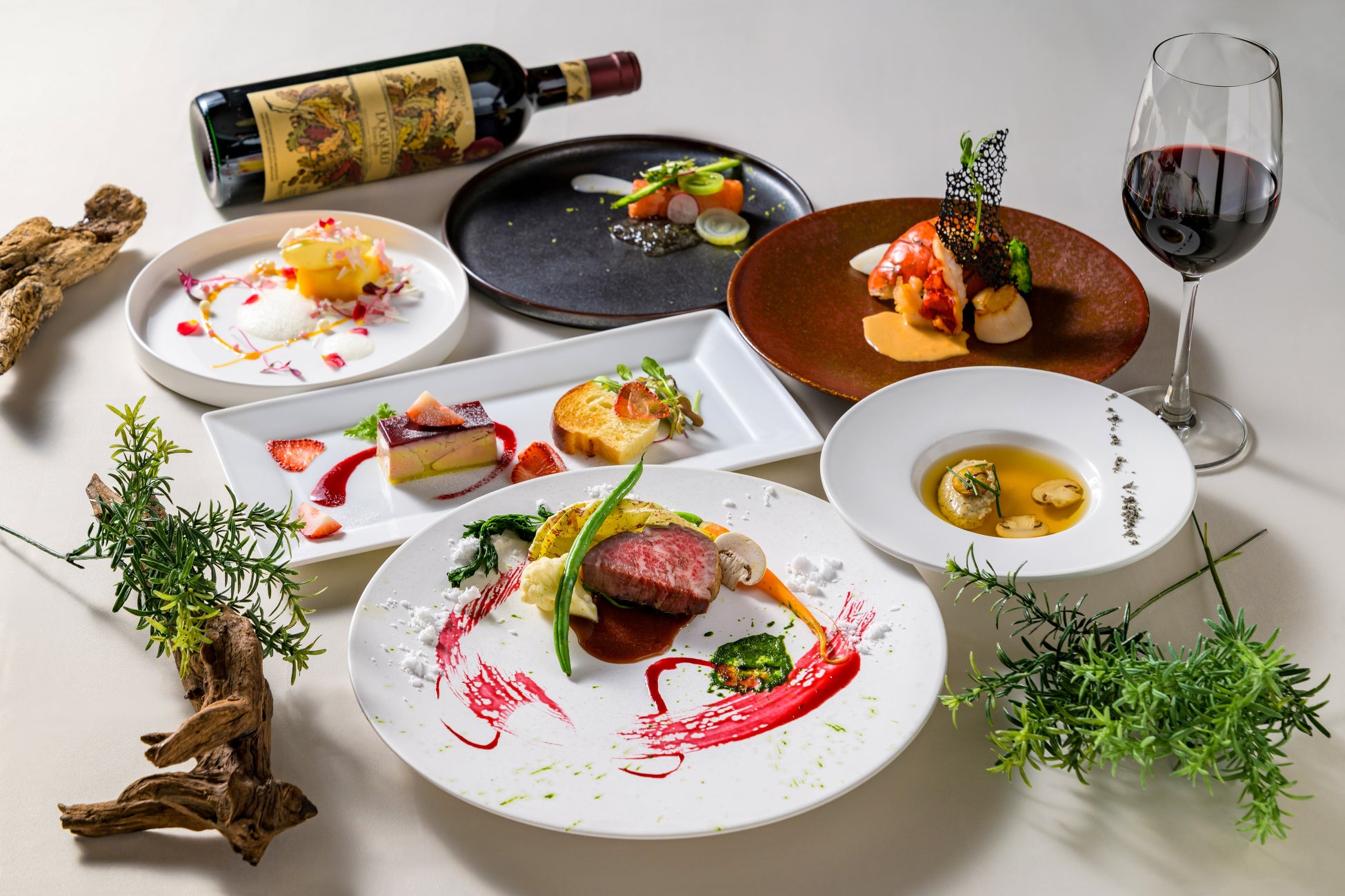 3時間煮込んだ赤ワインの牛頬肉や五島産金目鯛のフィルム包み焼きなどの厳選食材を使用したコースや、黒トリュフ薫る国産牛フィレ肉やオマール海老、ホタテなどの厳選食材を使用したコースをお楽しみいただけます。