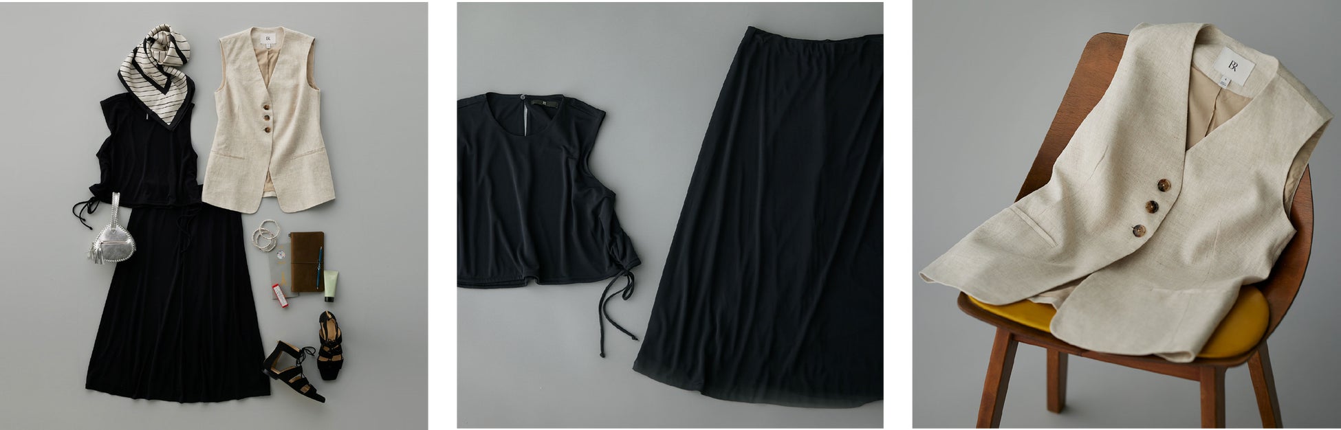 WOMENS:街歩きは動きやすく、それでいて洗練された装いで。セットアップでも単品でも着られる黒のトップ&スカートは、着回しが利くので旅に最適。きちんと感のあるベストはスタイリングのポイントに。