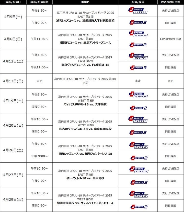 ■高円宮杯 JFA U-18 サッカープレミアリーグ2025 4月放送・配信概要