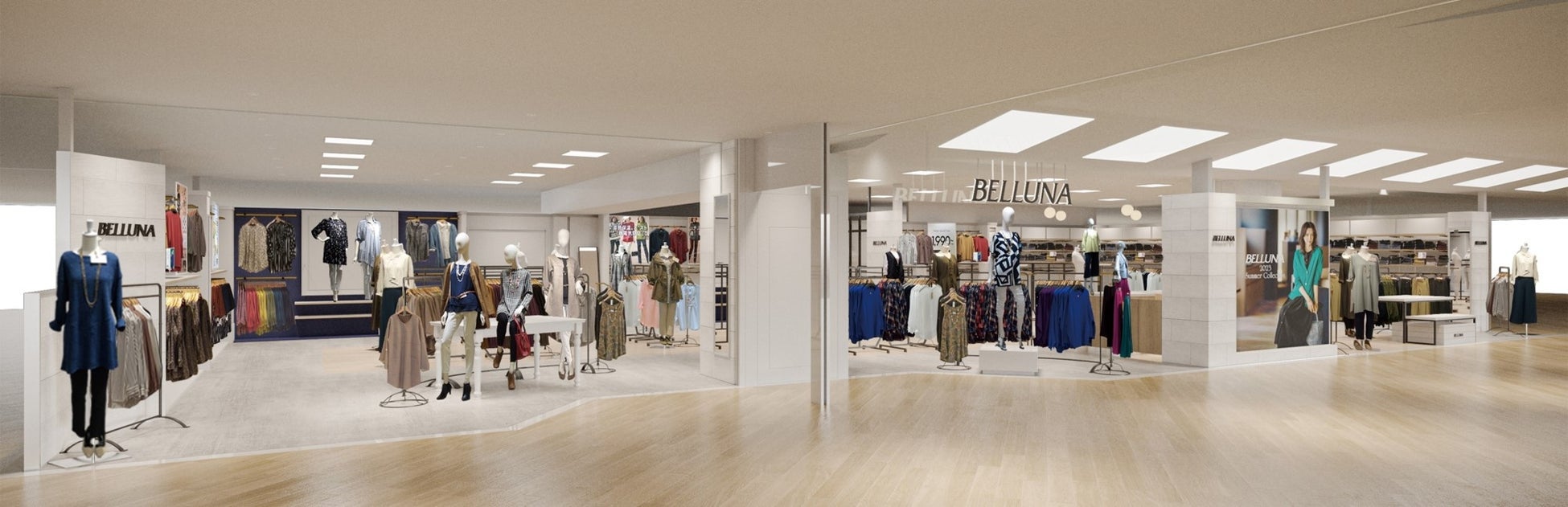 BELLUNA店舗は、2011年に茨城県のイオンタウン守谷店のオープンを皮切りに、お客様に通販と店舗の両方でお買い物をお楽しみいただけるように努めてまいりました。各店舗では、BELLUNAのカタログやベルーナオンラインストアで販売している商品に加えて、3~4割はカタログでは展開していない店舗限定商品にて構成されています。BELLUNA店舗は、通販カタログでの商品説明ノウハウを元に、お客様自身でもコーディネートしやすいような店舗を目指しています。