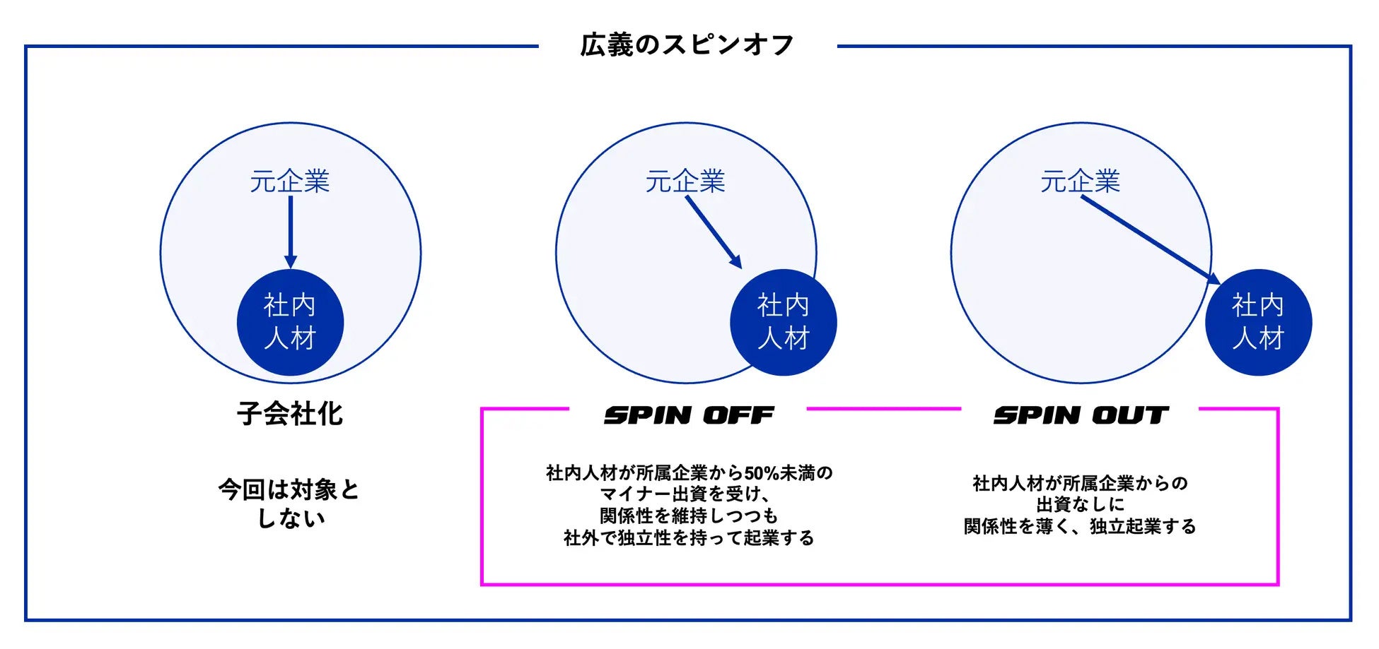 スピンオフ・スピンアウトとは: 本プログラムでは、スピンオフ(SPINOFF)は社内人材が所属企業から50%未満のマイナー出資を受け起業、スピンアウト(SPINOUT)は社内人材が所属企業からの出資なしに独立起業していることとしております。