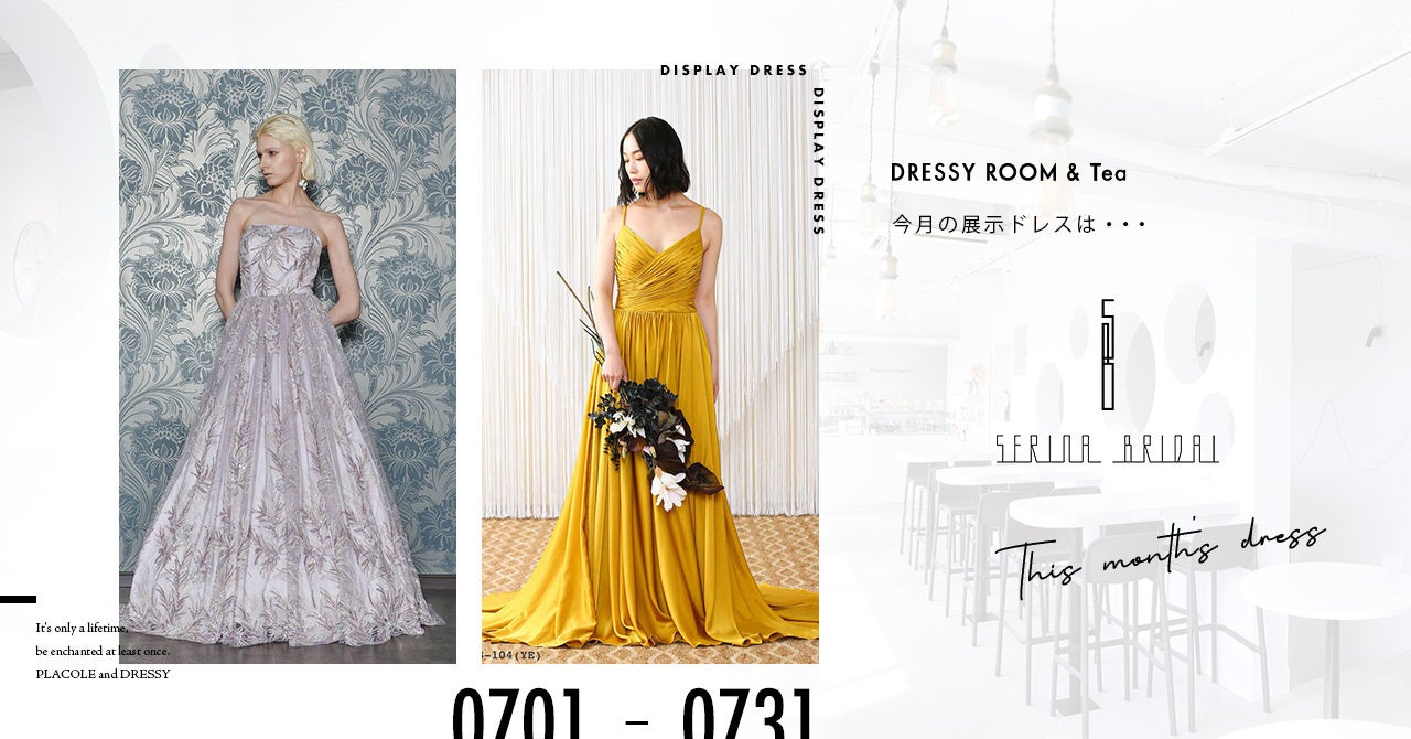 【DRESSY ROOM&Tea】7月のディスプレイドレスは『SERINA BRIDAL』のウェディングドレスを期間限定でお届けいたします。