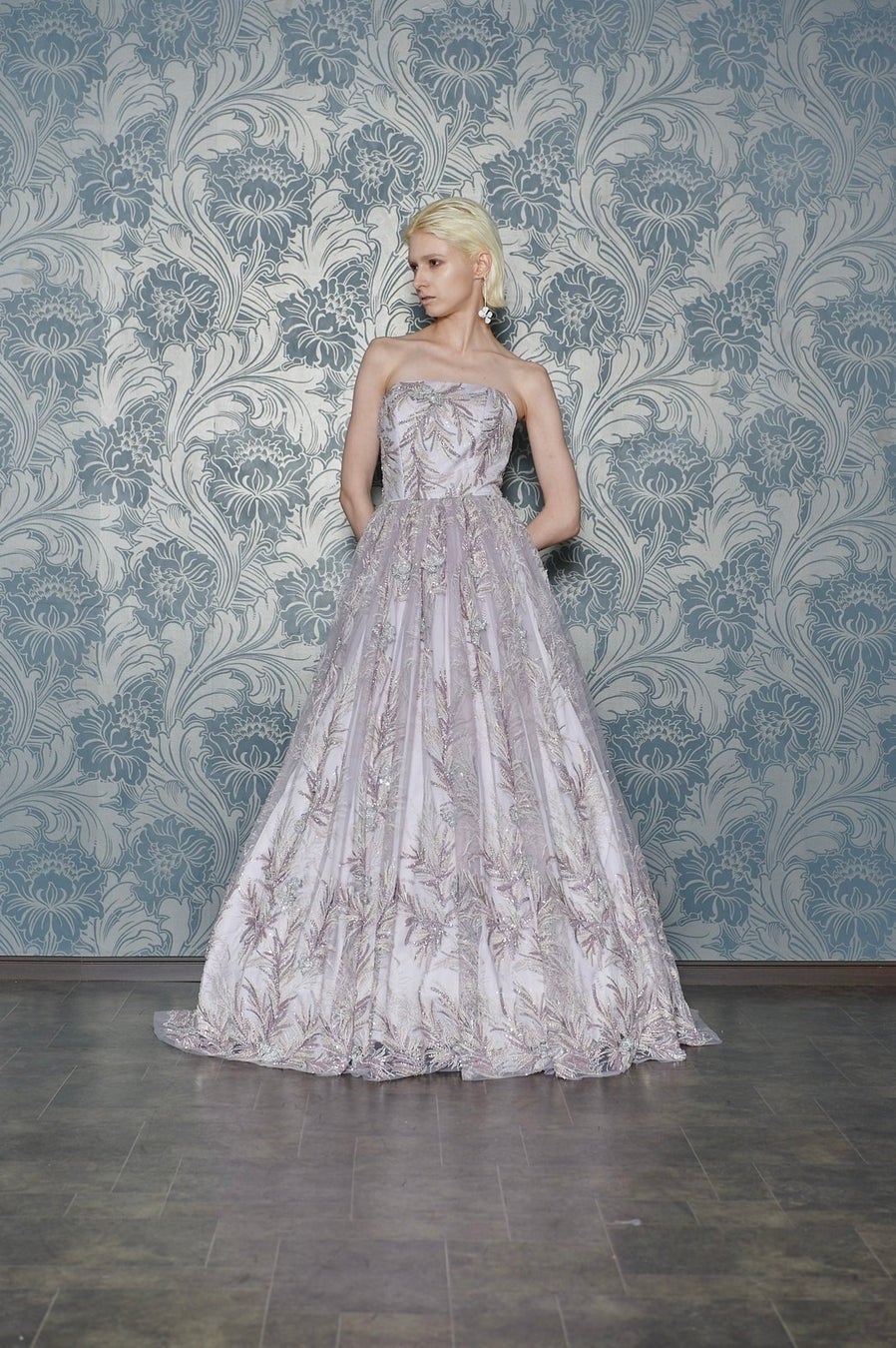 ボタニカルな刺繍が美しい、ラベンダーカラーのドレス。スパンコールやビーズの煌めきが目を惹きます。シンプルなシルエットと大胆な刺繍柄の組み合わせがおしゃれで、セリナブライダルらしい1着。