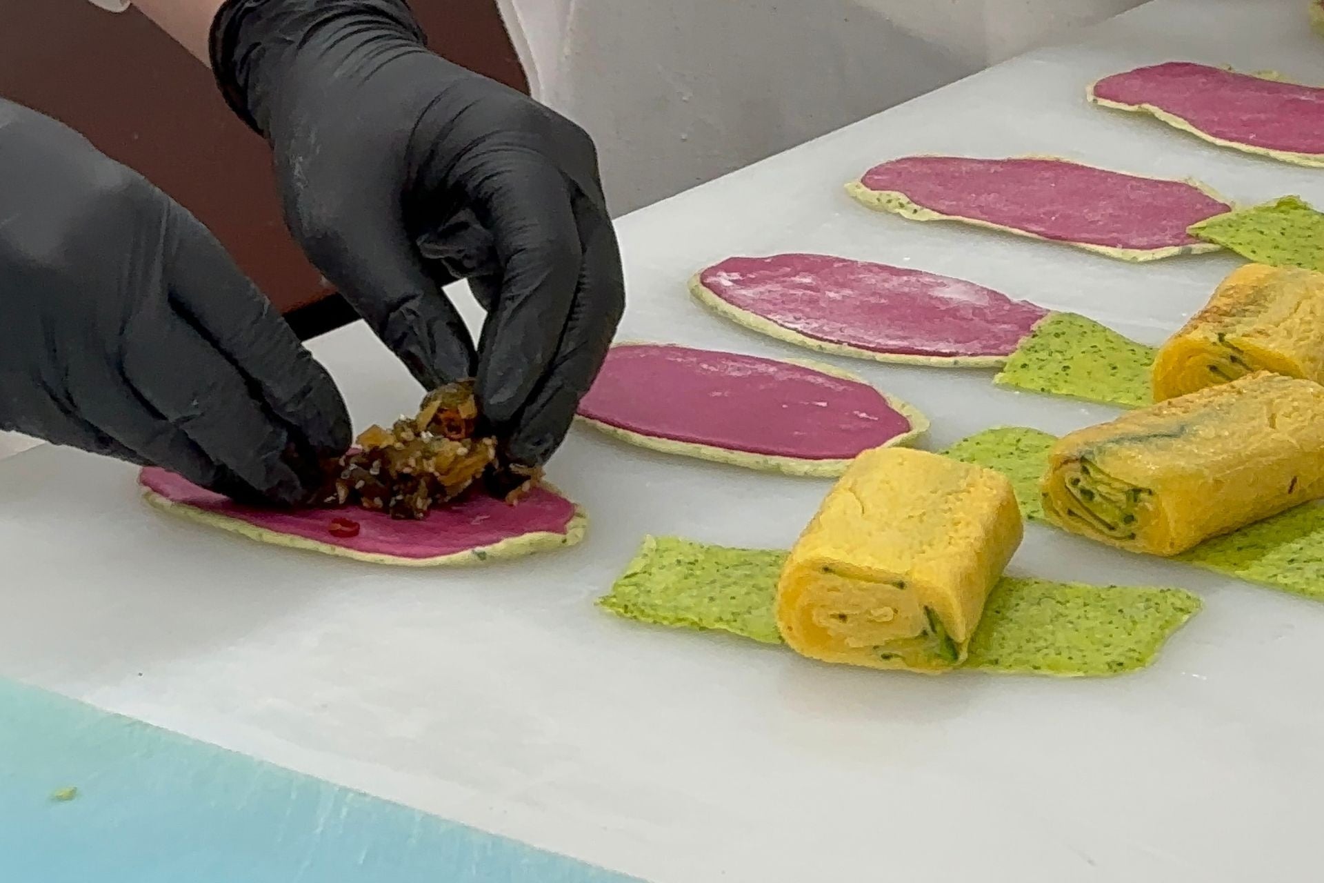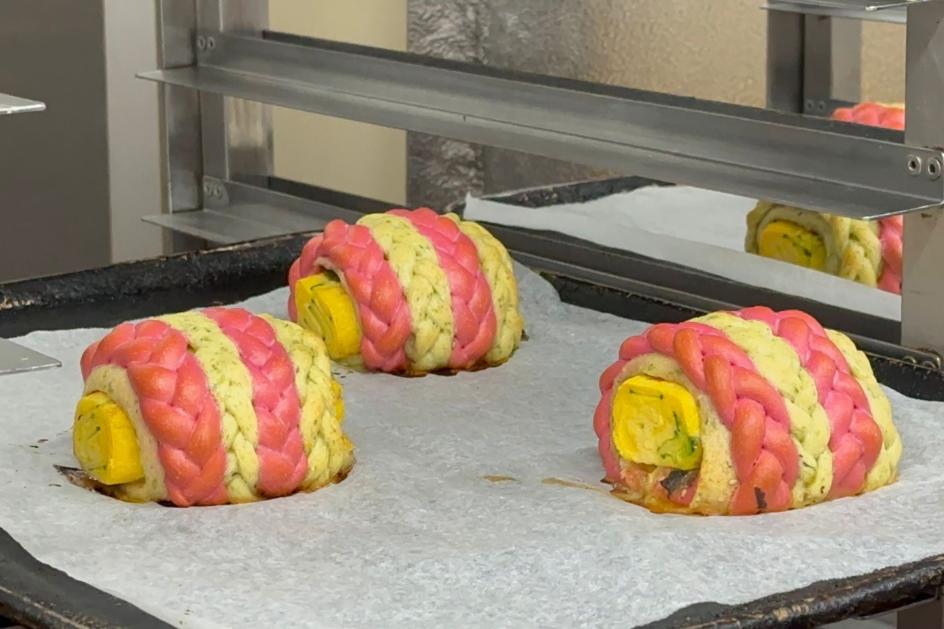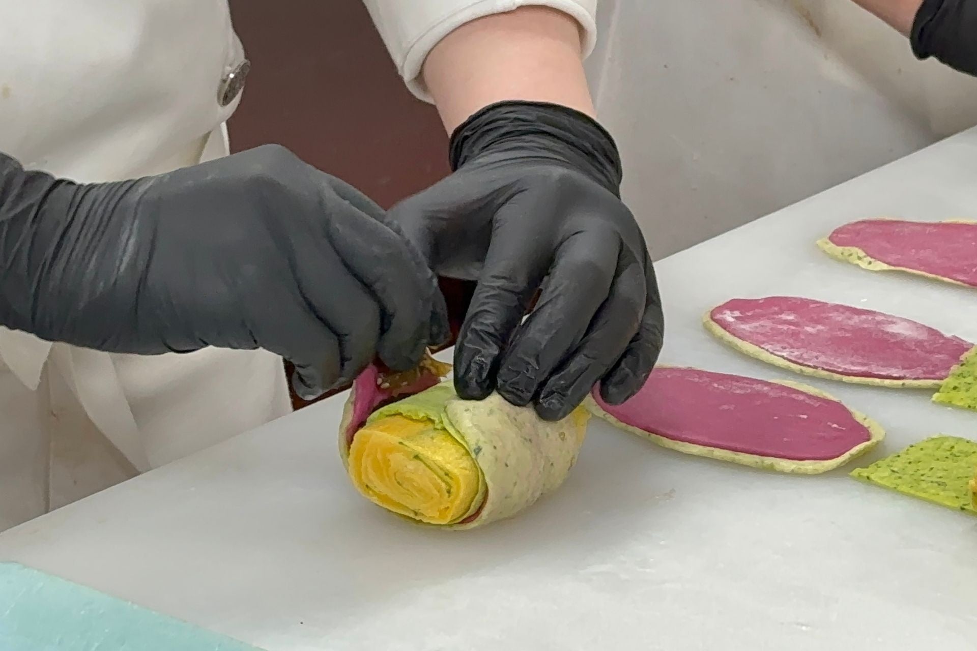 A:はじめからキュウリに勝算があったわけではありません。水分量が多く味も淡いキュウリは、パンに向かない素材だと感じていました。ただ、その弱点を欠点ではなく活用する発想に切り替えました。水分は生地の仕込み水として活用し、味の淡さは食感を残すことで「キュウリらしさ」として表現しました。ピューレ状にすることで水分量を正確に管理できたことも大きなポイントです。農家さんから学んだ時点で佃煮の使用は決めていましたが、それだけではパンとしてのインパクトに欠けるため、組み合わせる素材を模索し、だし巻き卵に辿り着きました。当ホテルは海外からのお客さまが多く、日本の方にも海外の方にも喜ばれるパンを目指しています。たまごサンドの人気をヒントに、日本らしさのあるだし巻き卵なら受け入れてもらえると考えました。結果として、キュウリの佃煮との相性は非常に良いものでした。今回の作品は「和」を軸に構成しています。生地にはおから、豆乳、あおさを使い、甘味にはみりんシロップを使用。具材も含め、全体を和の方向性で統一したことが相性の良さに繋がったのだと思います。見た目にもこだわり、だし巻き卵の黄色、キュウリとあおさの緑、ビーツのピンクで構成しています。一色ではなく、カラフルで視覚的にも印象に残る仕上がりを意識し、だし巻き卵はあえて大きめにして、しっかりとした存在感を持たせました。