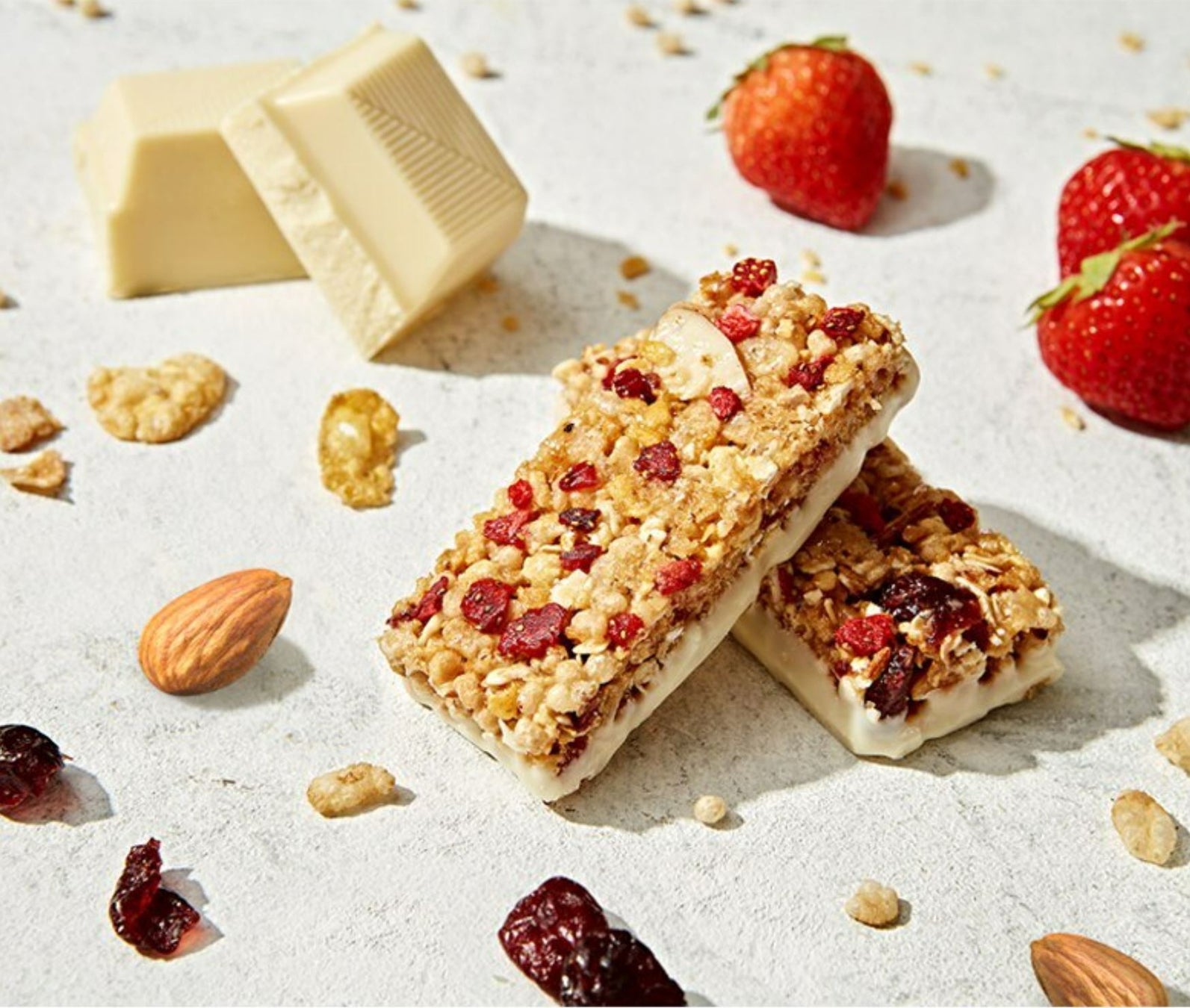 爽やかな甘酸っぱさのクランベリーやイチゴにカリカリ食感のアーモンドなどのナッツをミックスし、ホワイトチョコレートでコーティングしたナッツバー。
