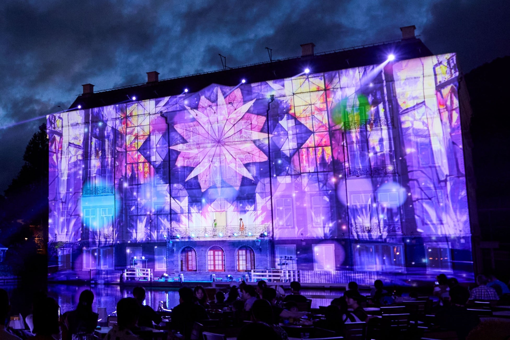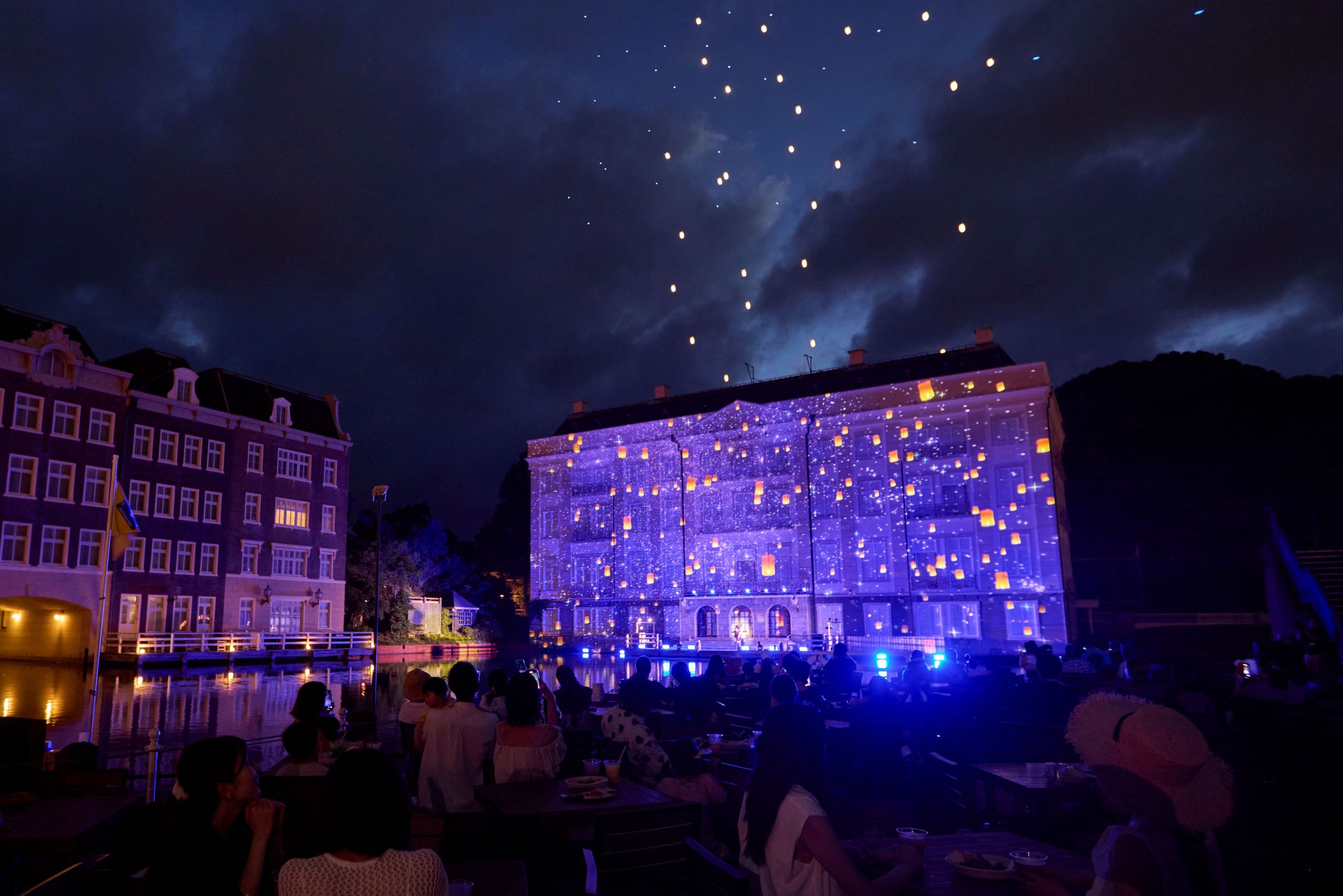日が暮れてヨーロッパの街並みに淡いライトが灯ると、ドムトールンの麓にある運河テラスバル付近には、お酒や食事を楽しむゲストが集まり始めました。そして、20時を迎えると、ショーキャストの声で会場の雰囲気が一変。まるでミュージカルの世界に入り込んだかのように引き込まれる新たな「スペクタクルランタンナイトショー」が初お披露目しました。
