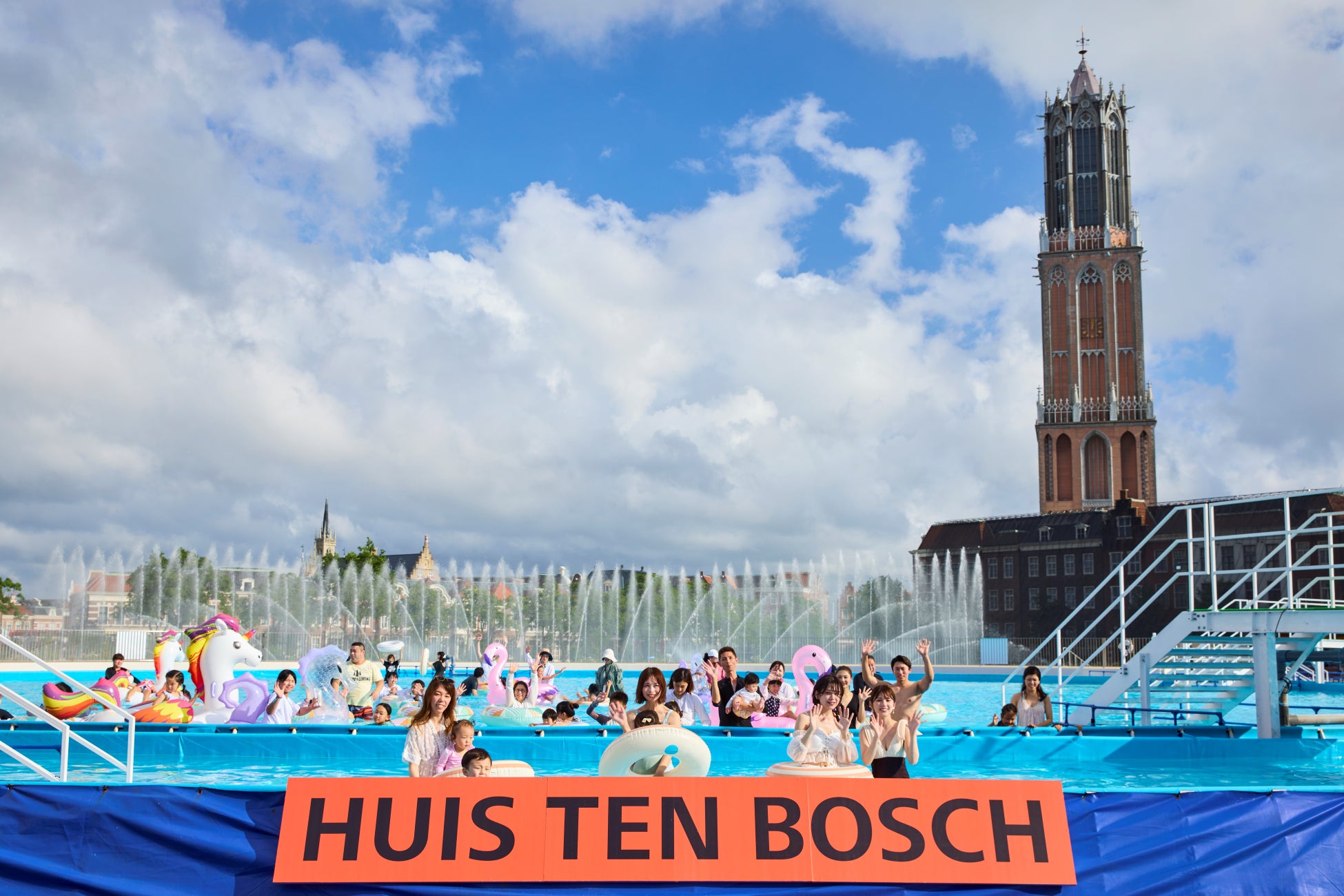 その後ゲストは街並みや噴水をバックに写真を撮ったり、流れるプールでゆったりするなどして時間を過ごし、子供たちは浮き輪を使って泳いだり水をかけ合ったりと、きらきらした笑顔で遊ぶ様子が見られました。