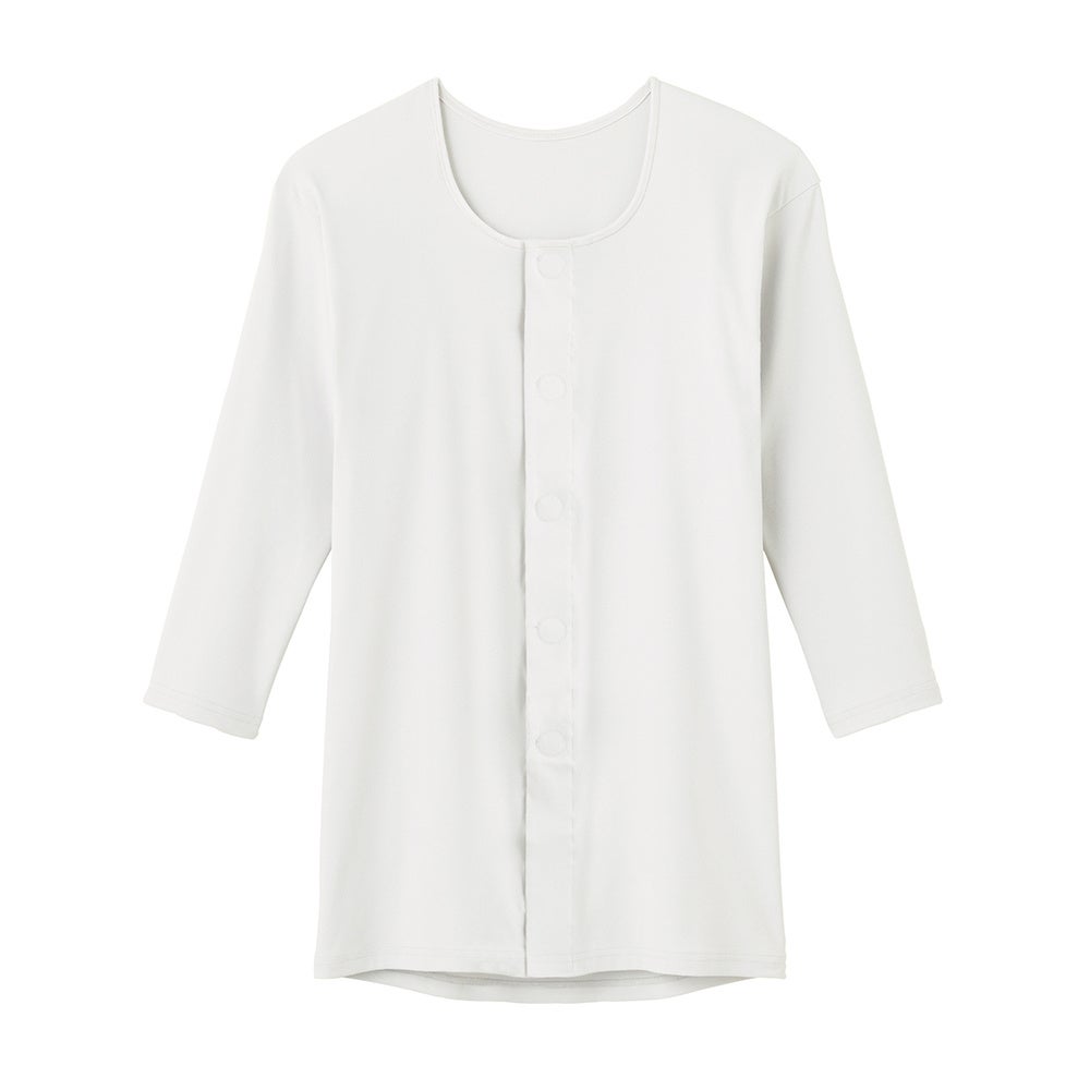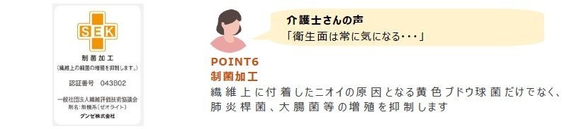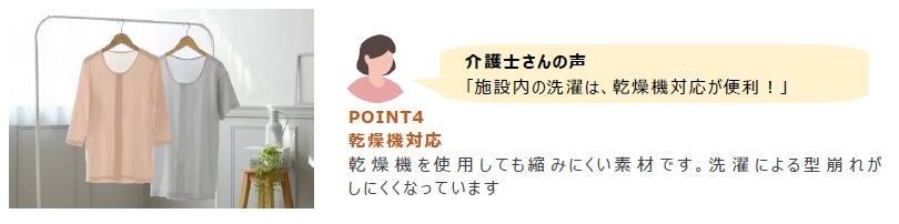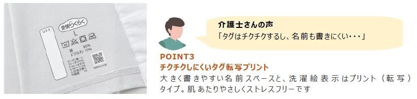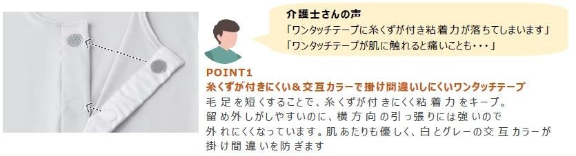 考えた商品グループで、介護や検診時に便利な前あき肌着などをラインアップしています。この度発売した「プレミアムライン」は、介護肌着を使用する際の「伸縮性のない肌着だと、着がえ時に本人も着せる側も大変で時間がかかる」「洗濯する度にワンタッチテープに糸くずが付いて粘着力が弱くなる」「テープが肌にあたり痛い」などの不満にフォーカスして開発した前あき肌着です。素材には、よく伸びてほどよいフィット感がある綿混素材を使用。大きめの袖付にするなどゆったり設計にすることで、脱ぎ着しやすくしました。また、毛足の短いワンタッチテープで肌あたりをソフトにするとともに、糸くずが付きにくく、粘着力をキープ。さらに、白とグレーのテープを交互に付けることで、見やすくなり掛け間違いを防ぎます。その他、施設での洗濯に対応するため、乾燥機を使用しても縮みにくくし、チクチクしやすいタグは転写プリントにして名前を書けるスペースを設けるなどの工夫を凝らし、着用される方の快適性に加え、介護現場のことも考えて改良を重ねました。