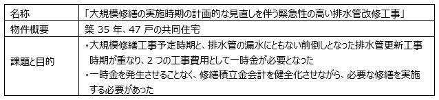 一定の要件(①25年以上の長期修繕計画に基づく修繕積立金額を設定していること②修繕積立金額が長期修繕計画額と概ね一致するもしくは計画より余裕があること③ライフサイクルコストの低減につながる長寿命化改修であること④新たな技術の導入や工期短縮に資する工法の工夫があること等)を満たすマンションにおいて長寿命化に向けて先導性が高く創意工夫を含む改修や修繕の取組として認められる事業