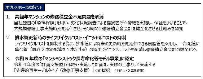 今後急増する高経年マンションについて、適切な維持管理を促進するとともに改修や建替によるマンションの円滑な再生を図る取組を促進する為、老朽化マンションの再生検討から長寿命化に資する改修や建替え等を行う先導的な再生プロジェクトを公募し、国が事業の実施に要する費用の一部を補助することにより、優良事例・ノウハウを収集しマンションの再生に向けた全国への普及展開を図ることを目的とした事業