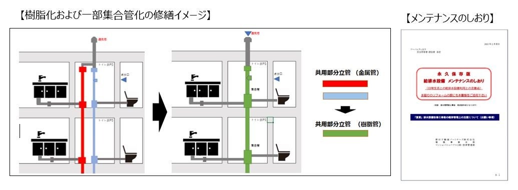 排水管更新は、将来の更新時期を延伸できる樹脂管を採用しライフサイクルコストを抑制します。加えて、一部配管には集合管(既存は2本の配管を1本にする)を採用することでイニシャルコストを削減し、修繕積立金会計の健全化に繋げています。