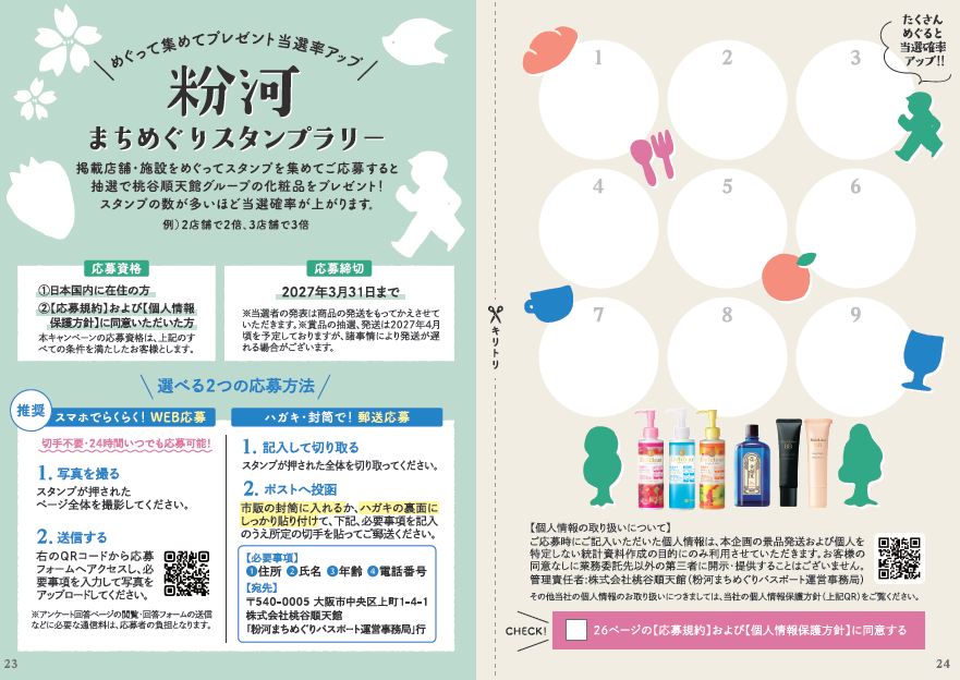 和歌山県紀の川市粉河で約400年前に創業した薬種商をルーツに持つ化粧品メーカー株式会社桃谷順天館(本社:大阪府大阪市中央区、代表取締役社長:桃谷誠一郎)は、創業の地である粉河エリアの地域活性化を目的とした特典付き冊子「粉河まちめぐりパスポート」を2026年4月27日(月)より発行いたします。本企画は、地域のにぎわいを再生する地域貢献プロジェクトです。参加店舗・施設で特典※1が受けられる「粉河まちめぐりパスポート」をきっかけに各店舗への来店を促し、地域との共創によるまち回遊の促進につながればと考えています。