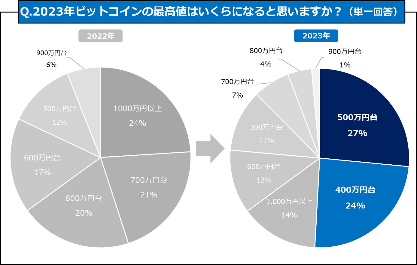 2023年、ビットコインの最高値は「400~500万円台」になると予想している人が約50%
