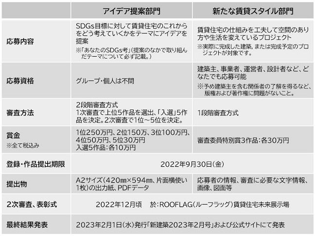 本コンペは2部門制となり、「アイデア提案部門」ではアイデアを、「新たな賃貸スタイル部門」では実際に完成した建築または完成予定のプロジェクトを募集します。提案の募集期間は、2022年4月1日(金)~2022年9月30日(金)となります。