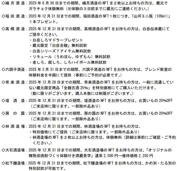 本イベントにて取得していただいたNFTを、各蔵元(現地)にてご提示いただくことで、特別な体験や