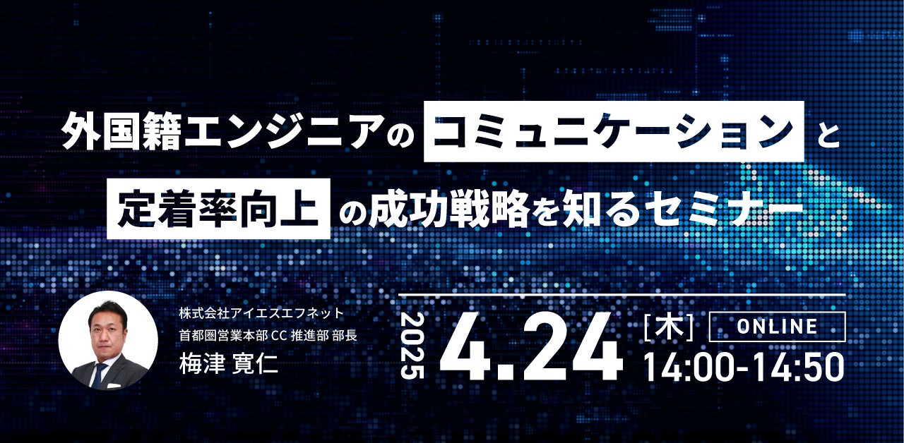 ITインフラソリューションを中心に、クラウド環境やネットワークシステムの構築・保守・運用におけるサービスを提供する株式会社アイエスエフネットは、2025年4月24日(木)の日程にて、「外国籍エンジニアのコミュニケーションと定着率向上の成功戦略を知るセミナー」を開催いたします。