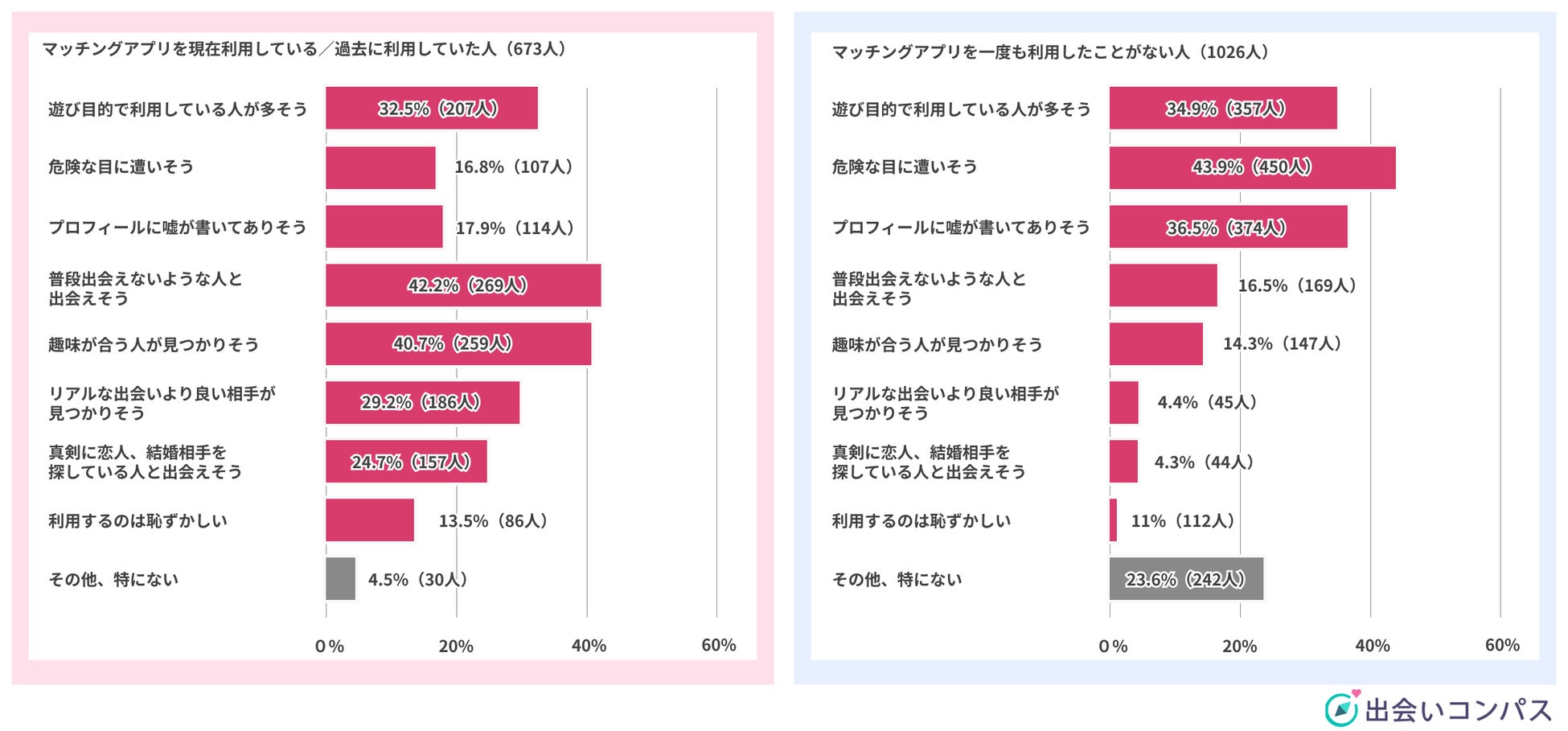 普及が進むマッチングアプリですが、まだまだネガティブな印象を抱いている人が多いことがわかります。