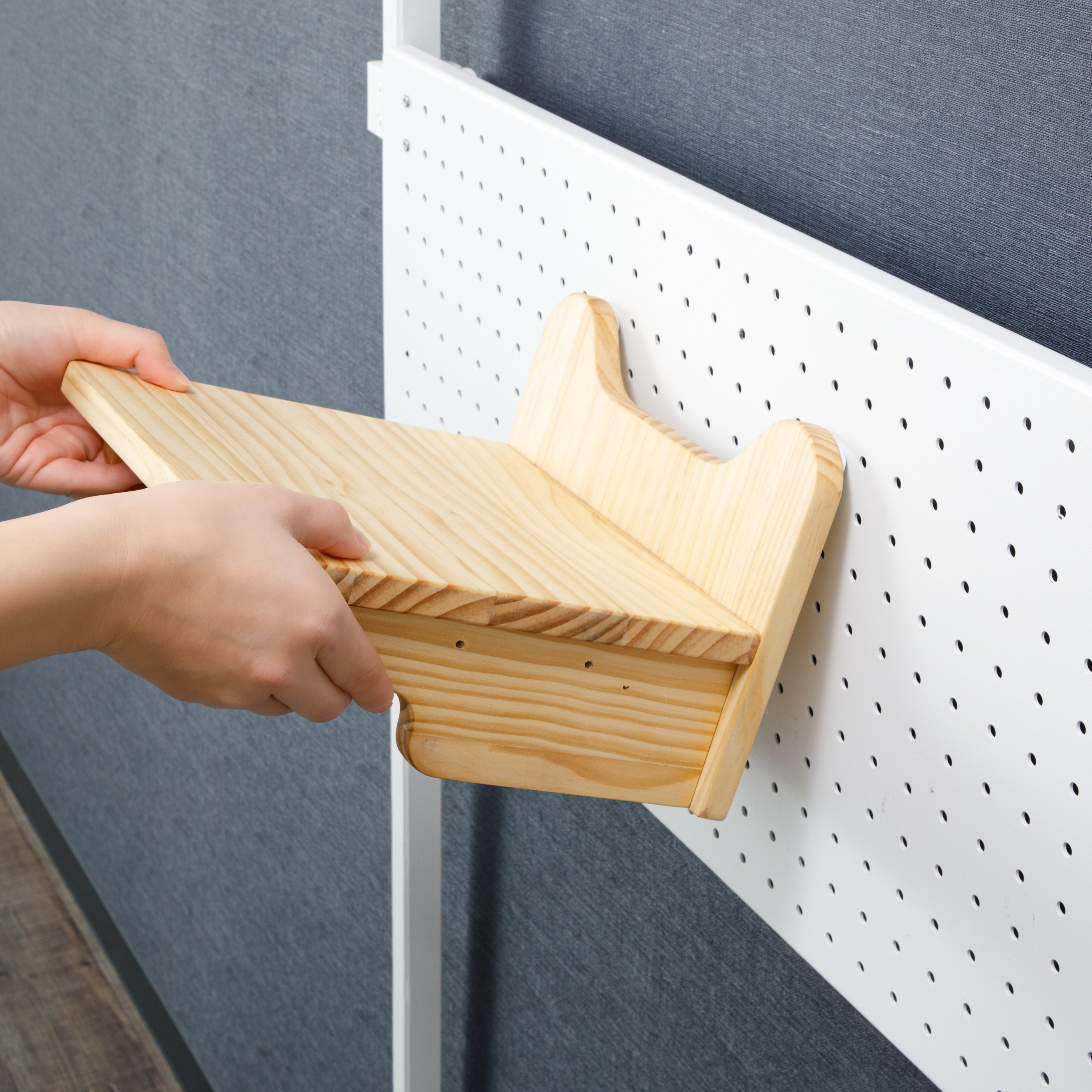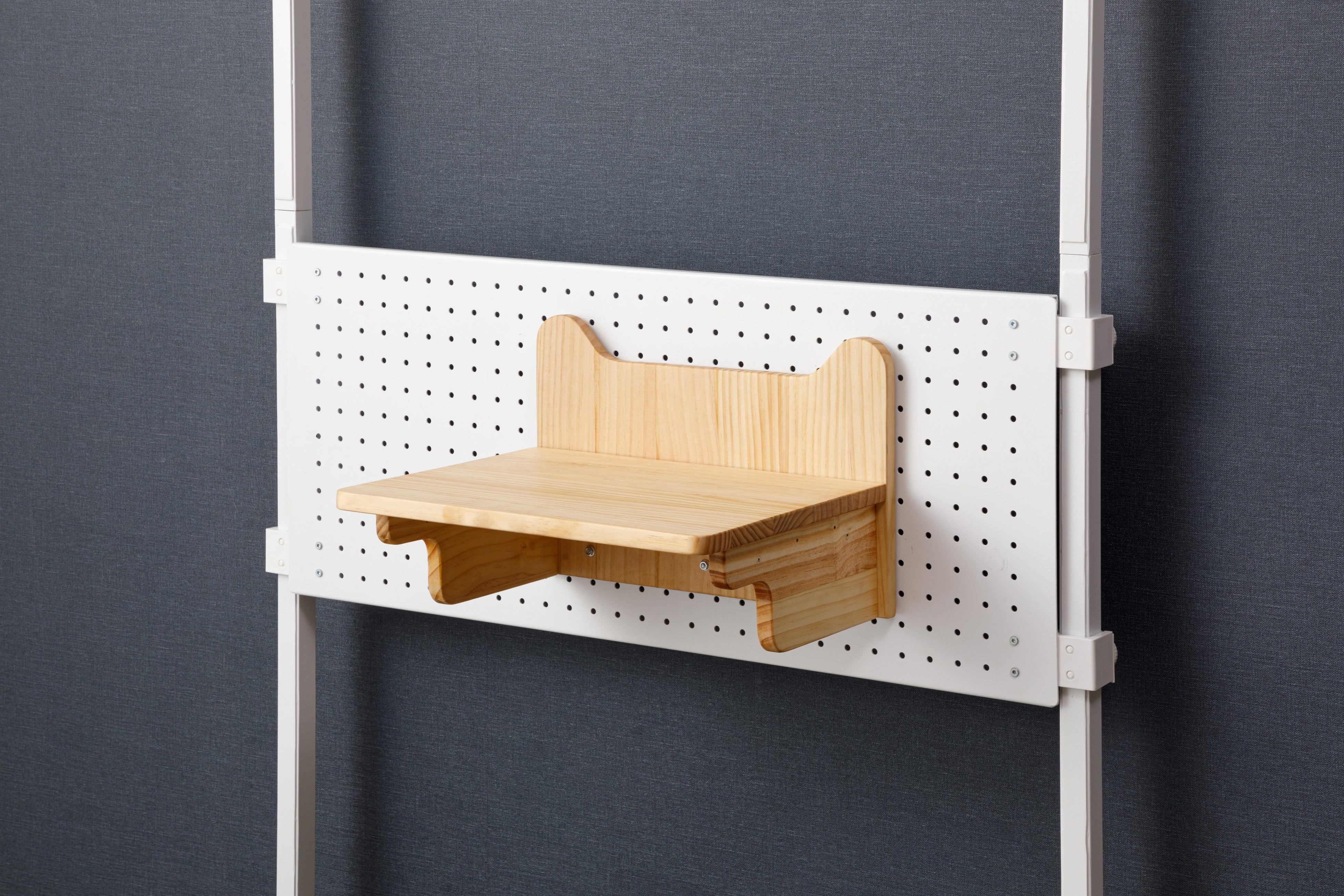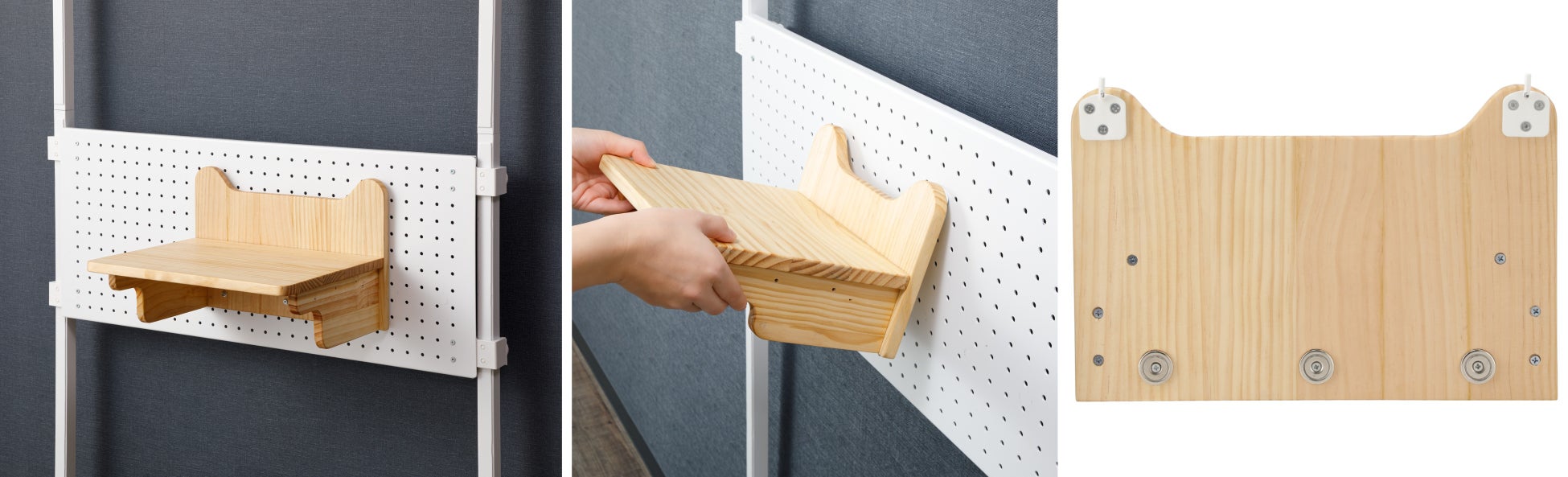ワンタッチで付け替えができる棚板です。棚板はパンチングボードにフックを差し込んで固定します。裏面の強力マグネットで、工具なしで取付けも取外しも簡単にできます。
