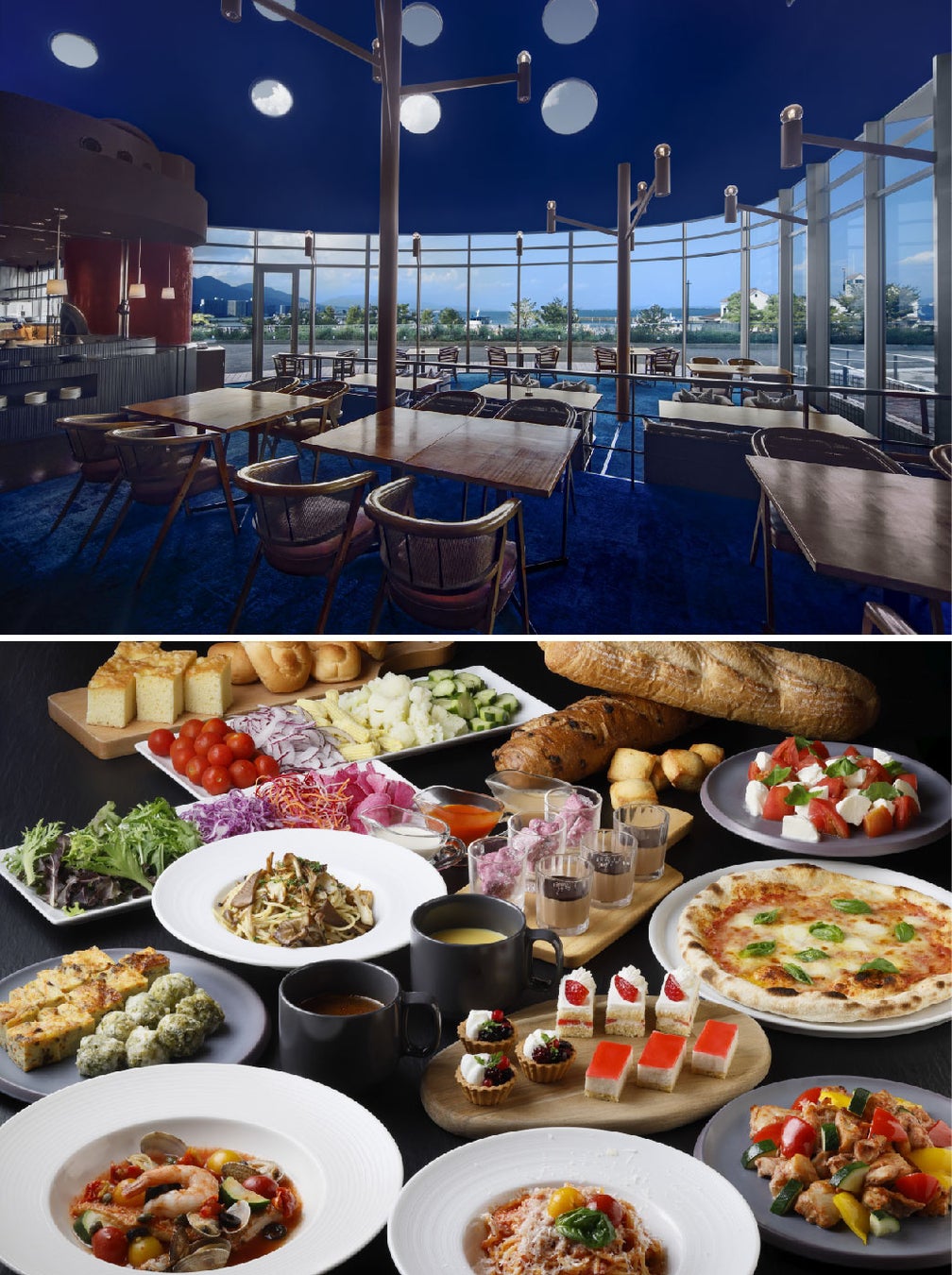 <メニュー(一例)>(前菜)彩り野菜のバルサミコ酢マリネ、滋賀県産トマトのカプレーゼなど/(温菜)野菜のピザ窯焼き 鮒ずしの米麹入りバーニャカウダ、滋賀県産卵と近江牛のフリッタータ、鶏肉と季節野菜のロースト タプナードソースなど/(ピッツァ)マルゲリータ、ジェノベーゼなど/(メインチョイス)パスタ きのこのペペロンチーノ、チキンドリアなど