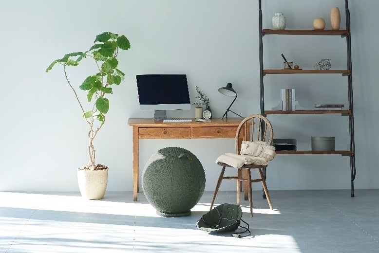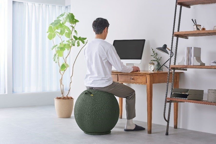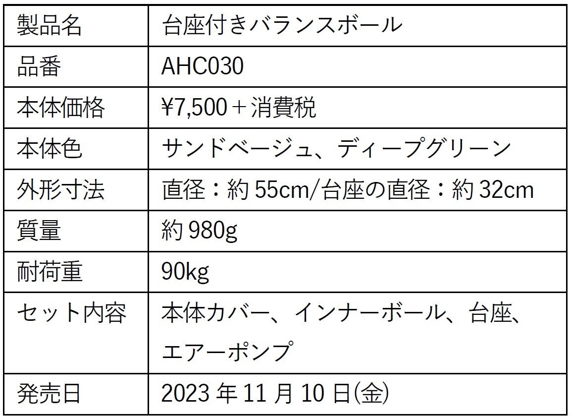 「台座付きバランスボール」は、台座付きで転がらず、自然に体幹をキープしながら座れるバランスボールです。初年度販売目標数量は6,000個です。