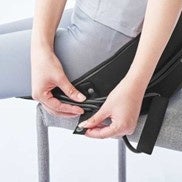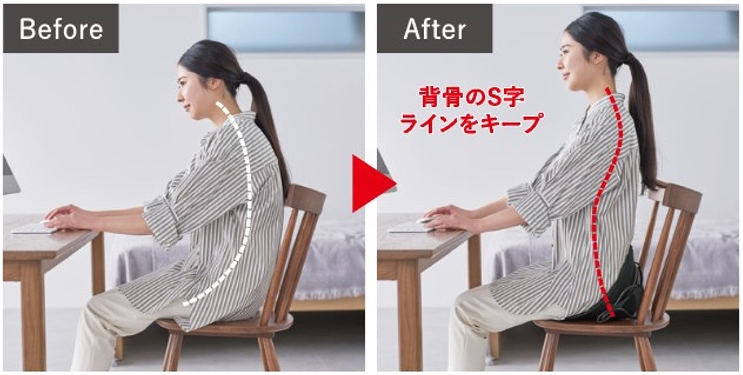 クッションを丸めたまま腰に着用します。姿勢が崩れがちなデスクワークでも、コルセットによって姿勢が矯正され、椅子の背と体が自然と近づきます。またクッションが腰当てになり、背骨の一番下にある仙骨を立たせるサポートをするので、骨盤が立ち、正しい姿勢で座ることができます。