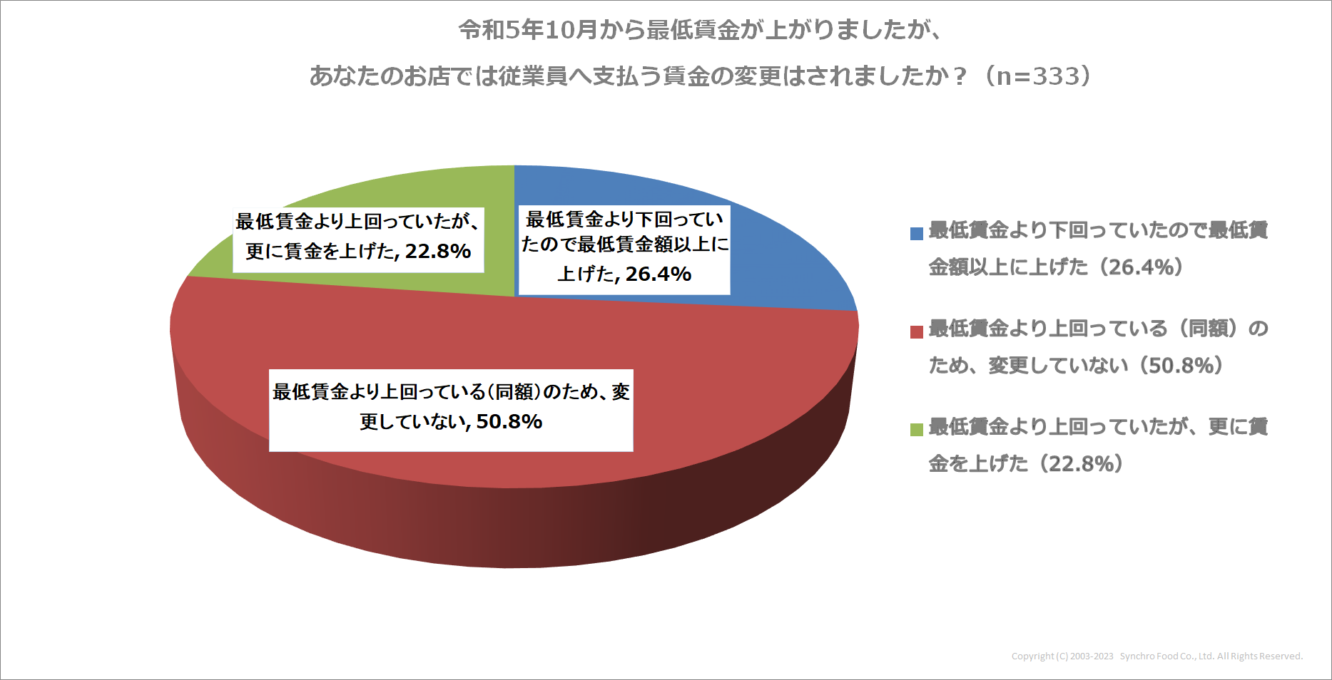 また、2023年10月の最低賃金の引き上げを受け、従業員に支払う賃金を変更したか答えてもらいました。すると、50.8%が「最低賃金より上回っている(同額)のため、変更していない」とする一方、49.2%は「賃金を上げた」と回答。このなかには、「最低賃金より下回っていたので最低賃金額以上に上げた(26.4%)」店舗だけでなく、「最低賃金より上回っていたが、更に賃金を上げた(22.8%)」という店舗も含まれています。