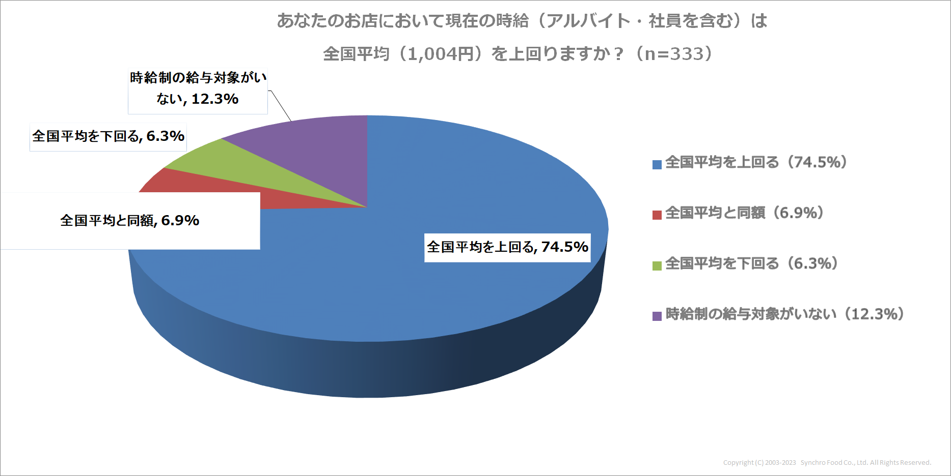 まず、現在の時給(アルバイト・社員を含む)が、全国平均を上回るか尋ねたところ、最も多かったのは「全国平均を上回る」との回答で74.5%。「全国平均と同額(6.9%)」、「全国平均を下回る(6.3%)」との回答は限られており、多くの店舗で全国平均以上の時給を支払っていることが分かりました。こうした結果は、回答者の多くが、東京・大阪・神奈川など、最低賃金が全国平均を上回る地域の飲食店経営者であることも影響していると考えられます。