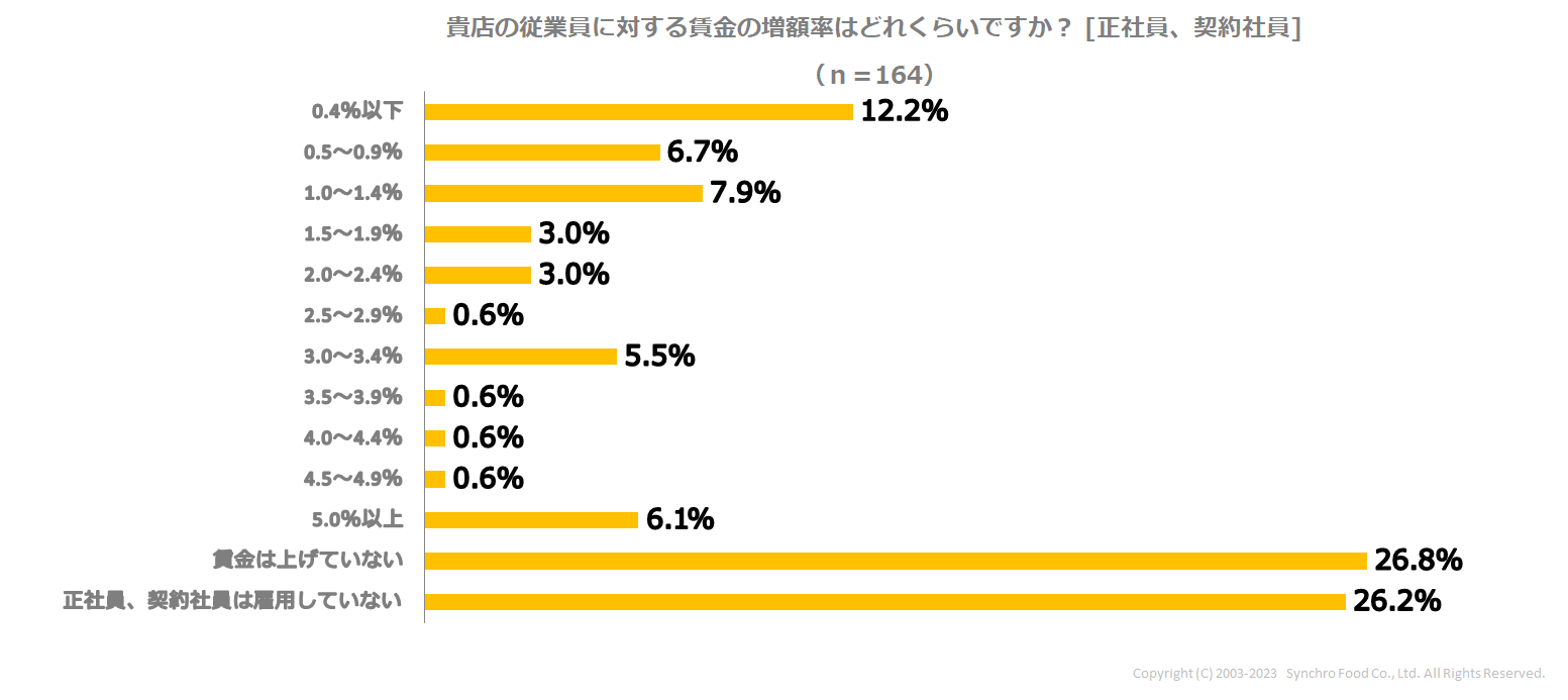 さらに、「賃金を上げた」と回答した方に、正社員や契約社員に対する賃金の増額率を尋ねました。すると、「賃金は上げていない(26.8%)」、「雇用していない(26.2%)」との回答を除くと、最も多かったのは「0.4%以下」との回答で12.2%。次いで、「1.0~1.4%(7.9%)」、「0.5~0.9%(6.7%)」との回答が続きます。