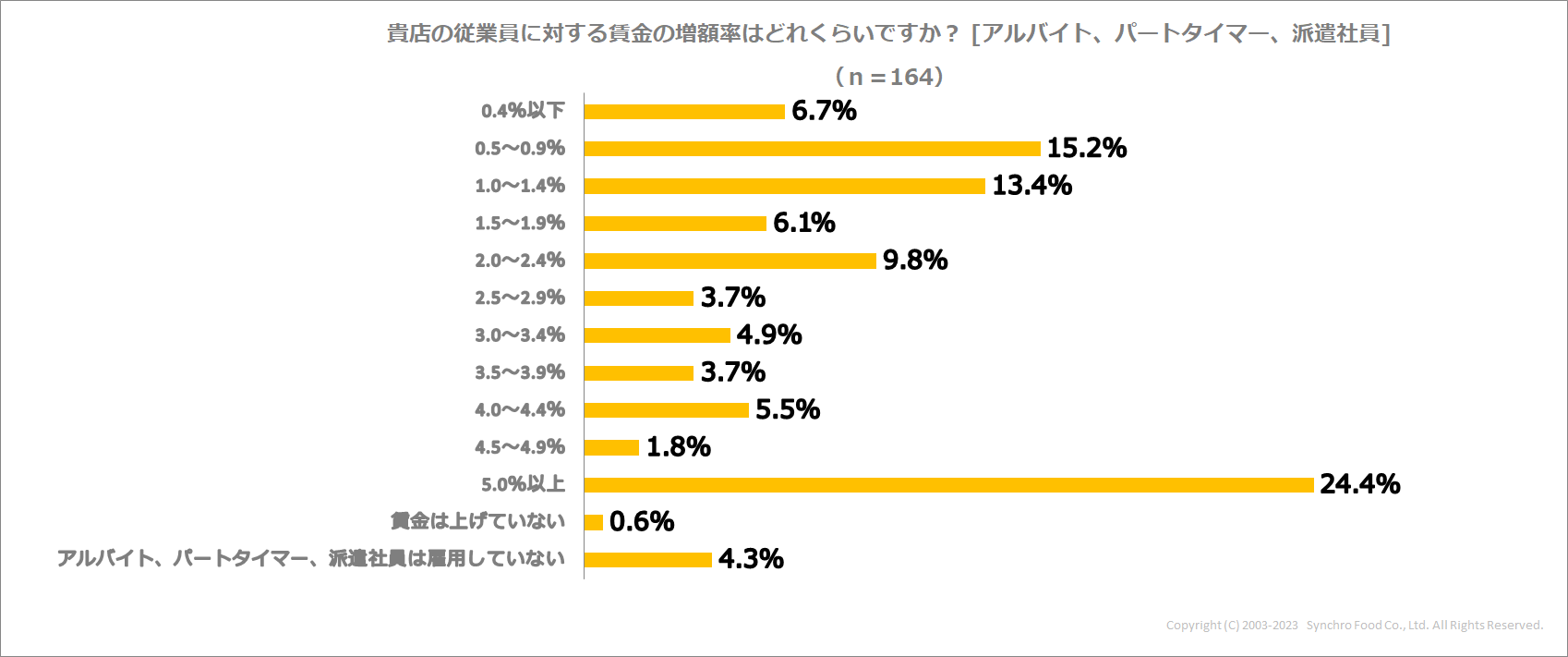 一方で、アルバイト、パートタイマー、派遣社員に対する賃金の増額率を尋ねたところ、最も多かったのは「5.0%以上」との回答で、24.4%。次いで、「0.5%~0.9%(15.2%)」、「1.0~1.4%(13.4%)」と続きます。全体を見ると、正社員や契約社員よりも、アルバイト、パートタイマー、派遣社員の方が、賃金の増加率が高いことがうかがえます。