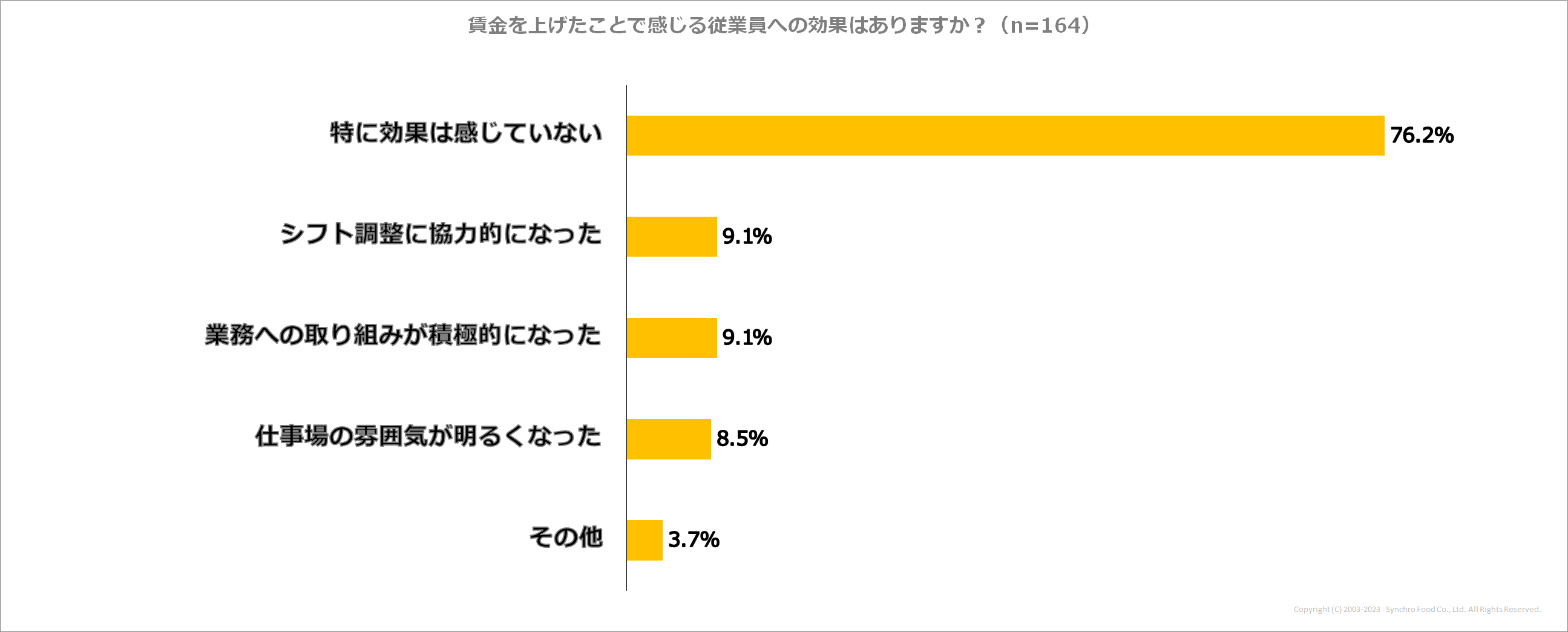 「賃金を上げた」と回答した方に、賃金を上げたことで従業員に何らかの効果があったか答えてもらいました。すると、「特に効果は感じていない」が76.2%で最多となり、効果が得られた店舗は1割程度にとどまりました。