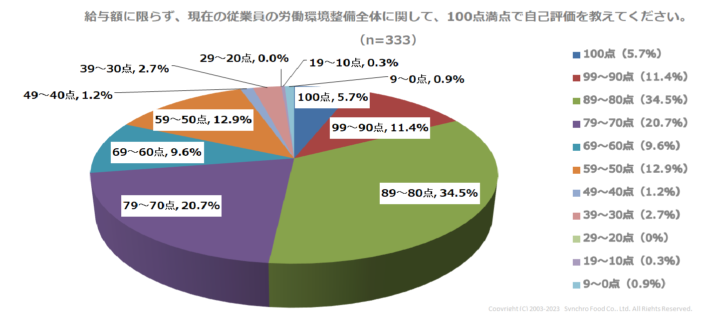 また、給与額に限らず、現在の従業員の労働環境整備全体に関して、100点満点で自己評価をしてもらいました。すると、最も多かったのは「80~89点」との回答で34.5%。次いで、「70~79点(20.7%)」、「50~59点(12.9%)」と続きます。全体を見ると、半数以上が「80点以上」と回答しており、従業員の労働環境整備に関して、概ね高評価をしている店舗が多いようです。