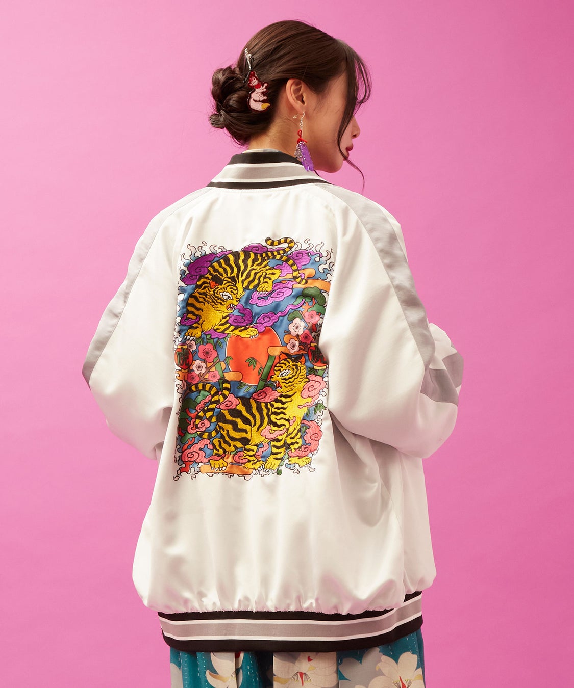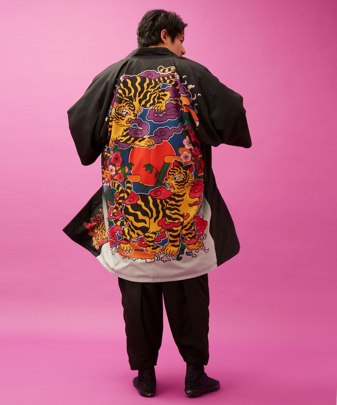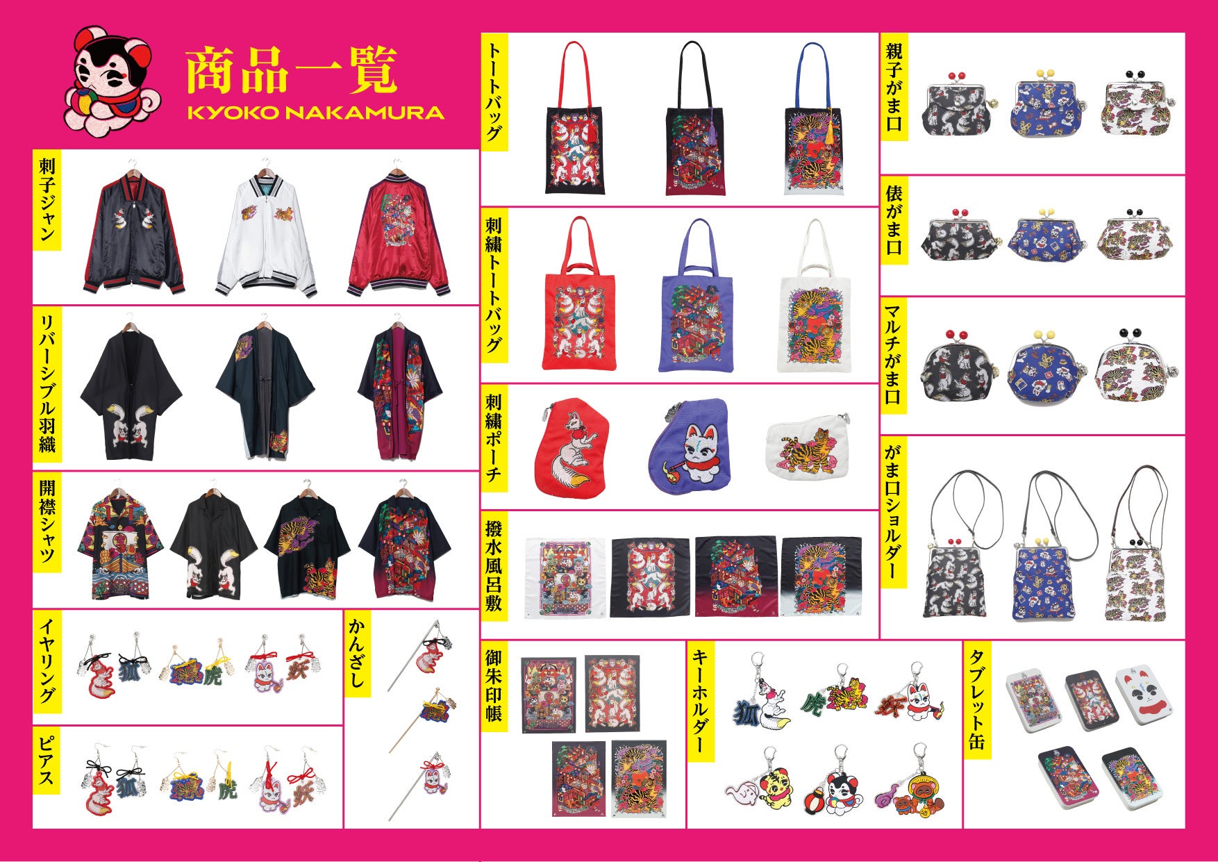 本コレクションのために描き下ろされた2つの新柄、「遊郭図(ゆうかくず)」と「虎」。妖怪たちが華やかに入り乱れる世界観と、力強くも艶やかな虎。中村氏ならではのネオレトロポップが凝縮された作品です。