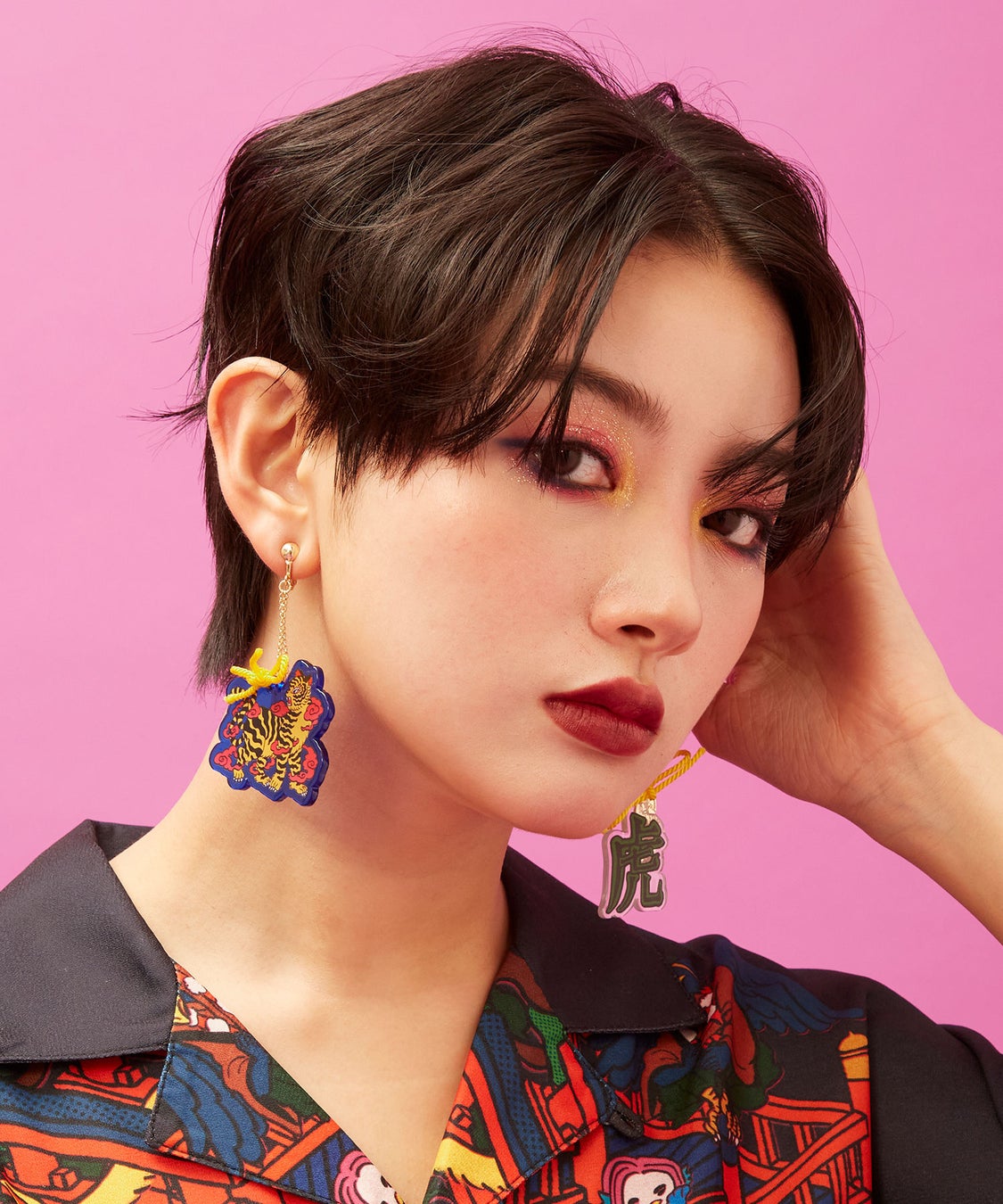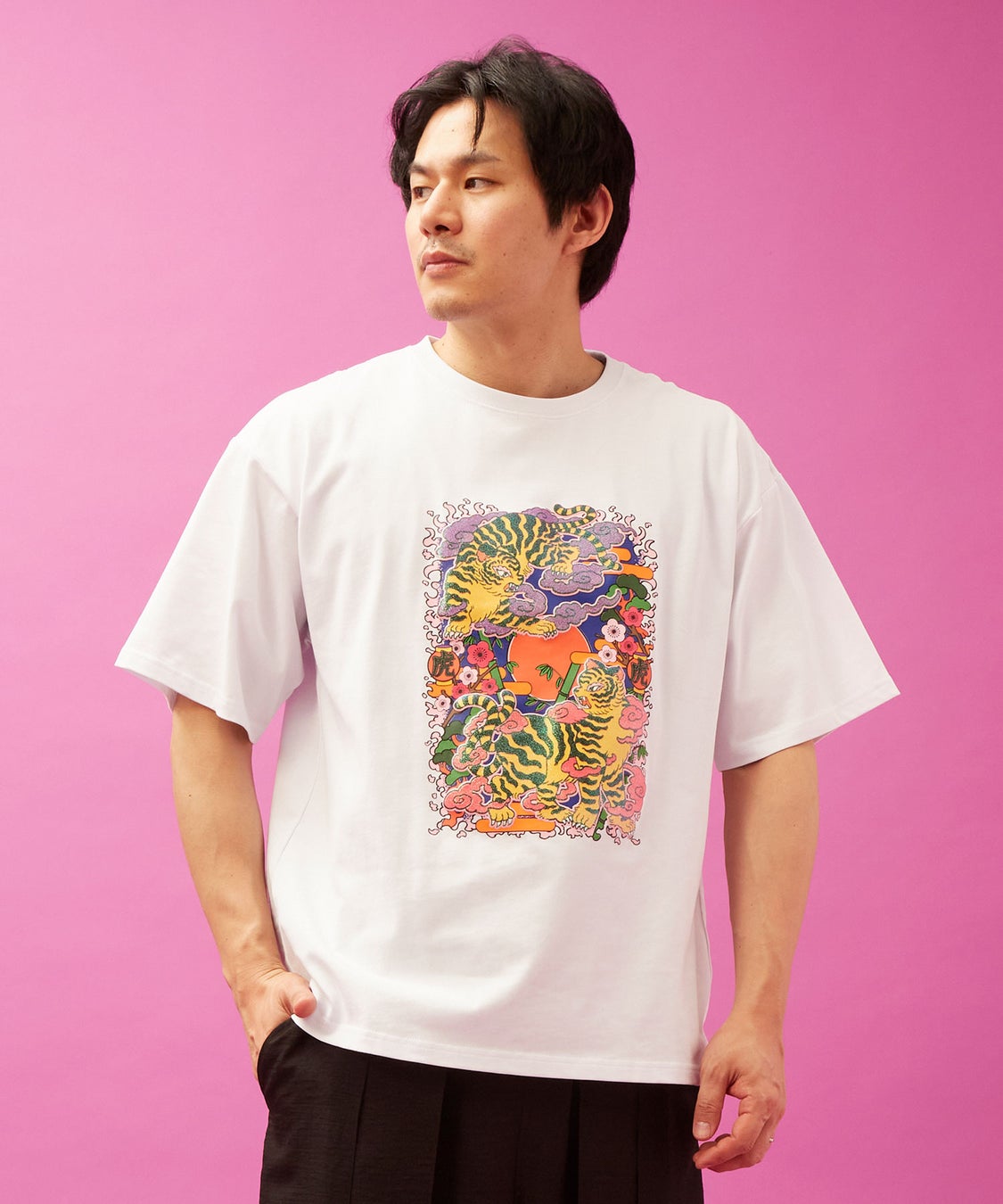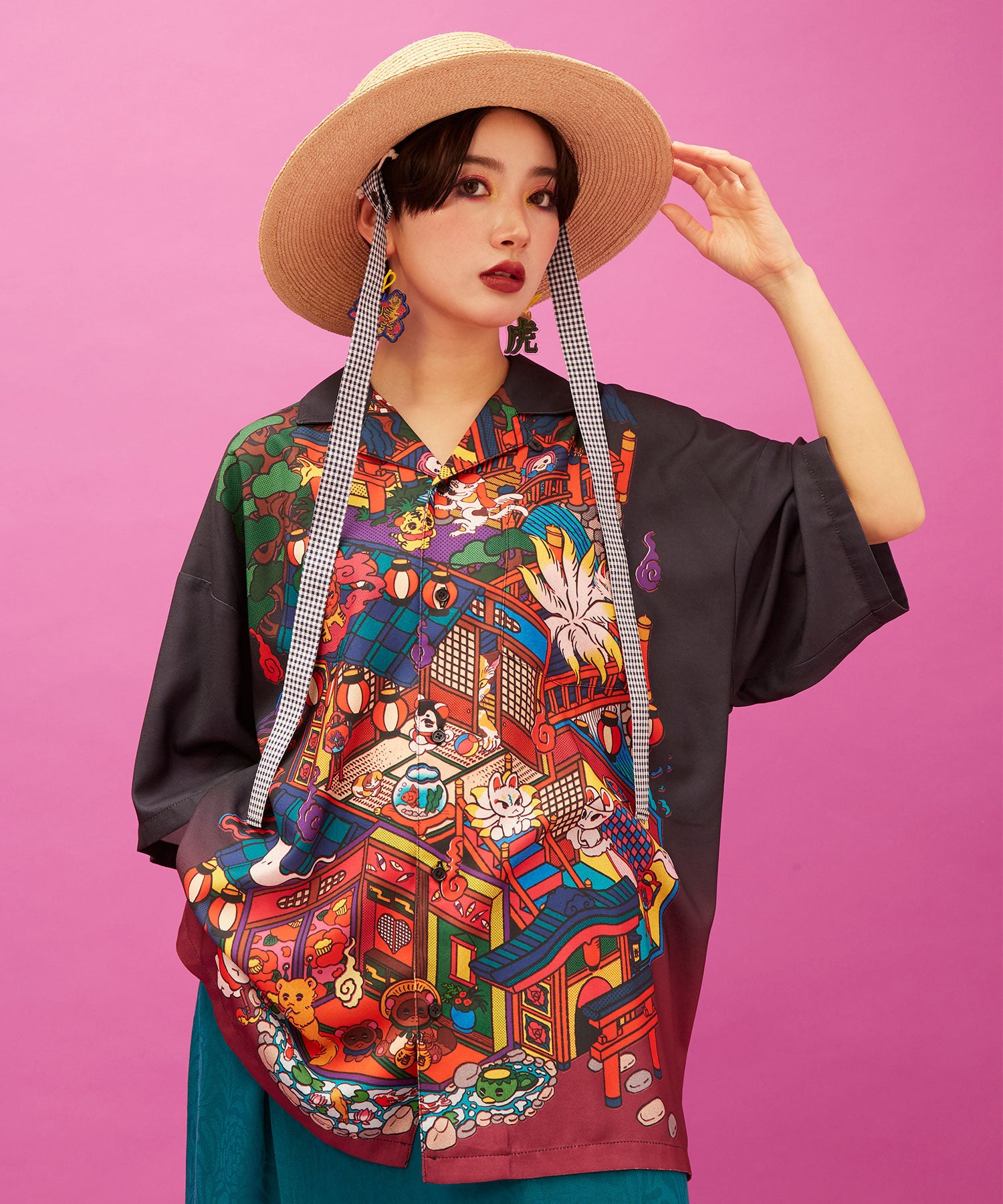 本コレクションのために描き下ろされた2つの新柄、「遊郭図(ゆうかくず)」と「虎」。妖怪たちが華やかに入り乱れる世界観と、力強くも艶やかな虎。中村氏ならではのネオレトロポップが凝縮された作品です。
