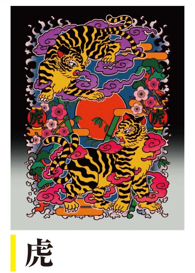 「喜々怪々」のテーマにあわせ、現実の虎とは少し姿が違う幻想的なデザインで表現。