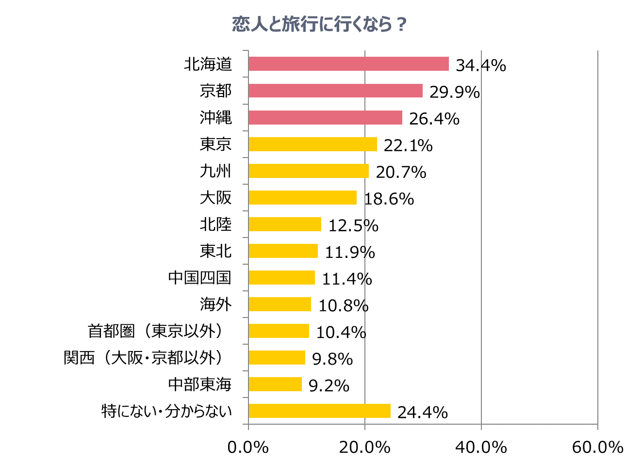 ウィンタースポーツや温泉、旬の魚介などグルメを楽しむなら今がまさにシーズンの北海道が堂々の1位となりました。また恋人と散策するのにうってつけの京都が2位、寒い冬にこそ行きたくなってしまう沖縄が3位でした。