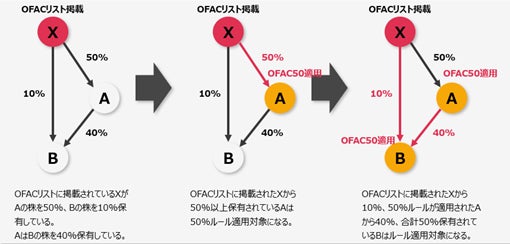 OFACは、外交政策・安全保障上の目的から、取引行為の対象とすることを禁じる国・企業・団体・個人などについて、制裁リストを作成・公開しています。また、それらのリストへの掲載者の実質的支配が疑われる(直接または間接的な株式の合計保有比率が50%以上)企業・組織などについても、同様に規制対象と見なし、取引を禁じています。OFACの制裁リストは、米国のみならず、国際的にも活用されており、多くの国や組織がこれを参考に制裁政策を定めている実態に加え、昨今の国際情勢を背景として、国際的なビジネスや取引における同制裁への対応は極めて重要です。