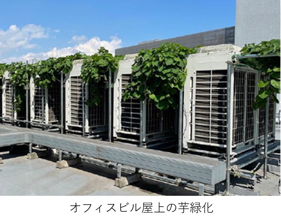 *1 株式会社日建設計と住友商事株式会社が共同で開発した技術で、空調室外機の周りに芋の葉を繁茂させ、葉による日陰効果と蒸散作用により機器周辺の温度を下げることで空調電力の低減効果を得る仕組み(2016年特許取得済)。