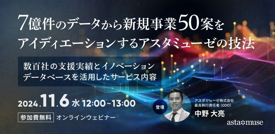 アスタミューゼ株式会社(本社:東京都千代田区、代表取締役社長 永井歩)は、2024年11月6日(水)12:00-13:00に、無料ウェビナー「7億件のデータから新規事業50案をアイディエーションするアスタミューゼの技法 ~数百社の支援実績とイノベーションデータベースを活用したサービス内容~」を開催いたします。アスタミューゼの新規事業支援サービスの手法を豊富な事例とあわせて解説します。