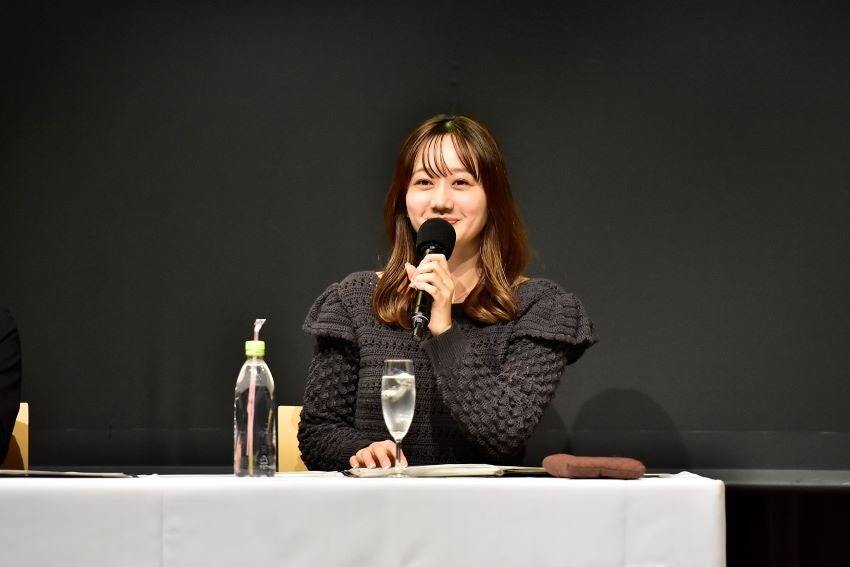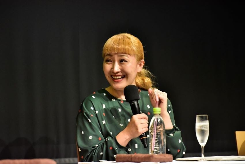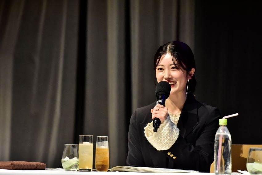 イベント冒頭、ゲストの高田秋、丸山桂里奈に続き、蒸留酒の専門家でライターの児島麻理子氏が登場し、出演者が揃ったところで最初の乾杯の時間に。ここで提供されたのは、この秋に収穫された芋を原料として今年初めて製造した「新焼酎」の炭酸割り。これを口にした高田は、「いい香り! 収穫したてのお芋の風味が感じられて、ほくほくですね」と語りました。