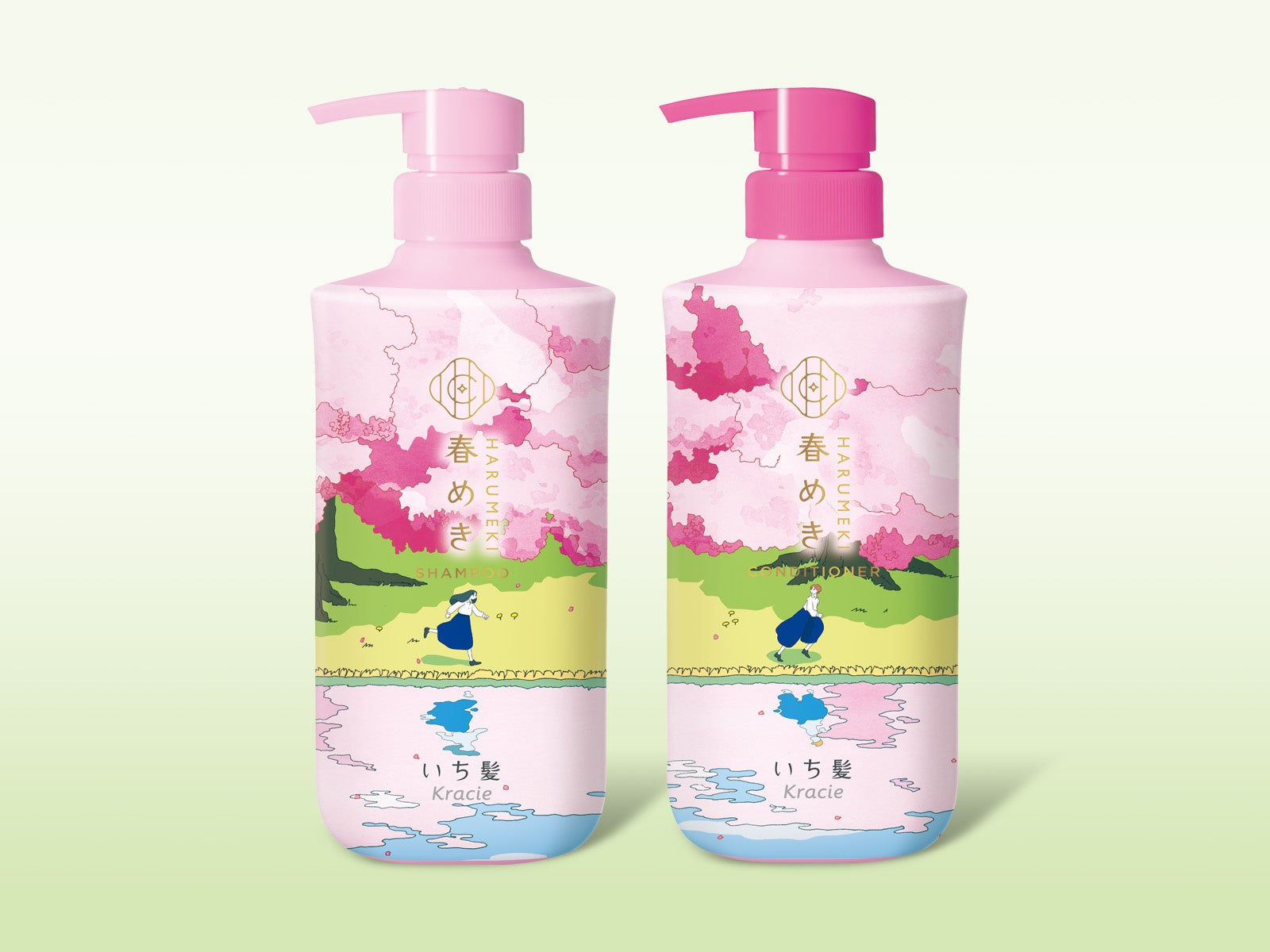 「いち髪」の “桜の香り”は、長年お客様に親しまれ、ブランドを象徴する香りでもあります。日本の風土や気候などの環境に合わせたヘアケア方法を研究している「いち髪」が、毎年好評の春を先取りする限定の香りとして選んだ「春めき」は、極めて強い香りを持つ桜の品種です。パウダリーで優雅な香りが特徴で、1本の「春めき」があれば、離れていてもその香りを感じられます。今年の限定デザインボトルには、春が訪れて浮き足立つような気持ちを軽やかに遊ぶ様子で表現しました。水面に映る桜の美しさも描かれ、春の情景が「春めき」の香りとともに広がります。