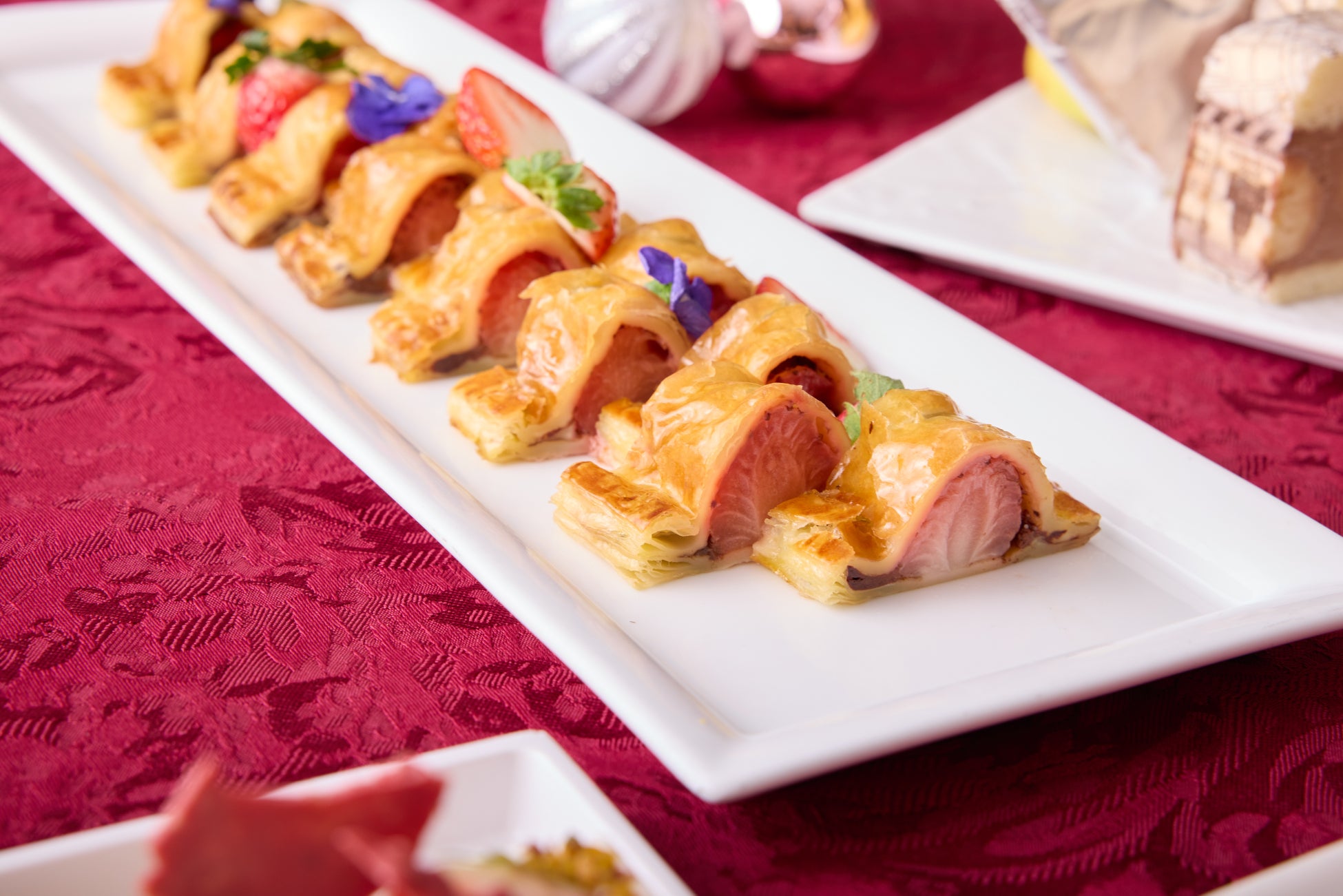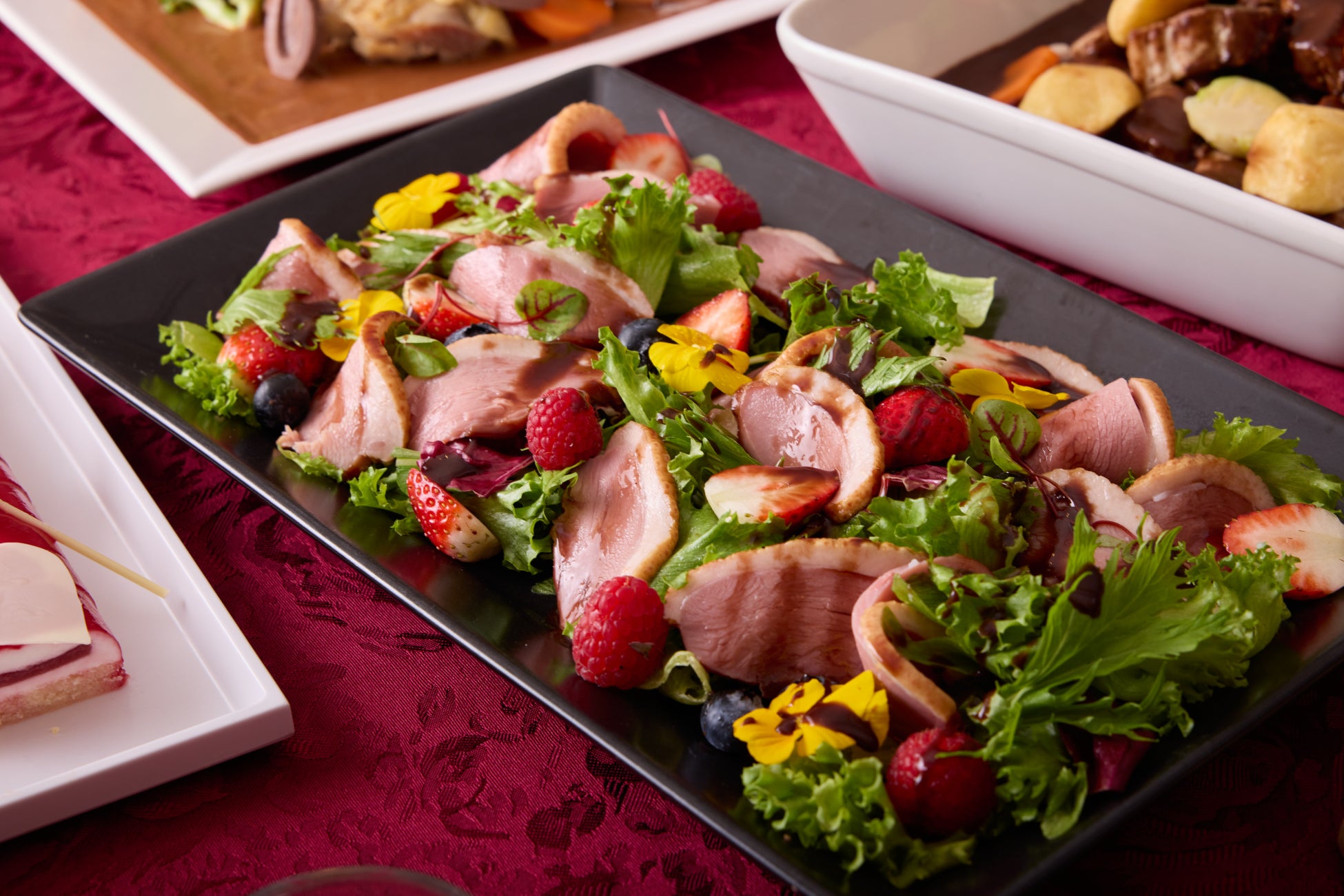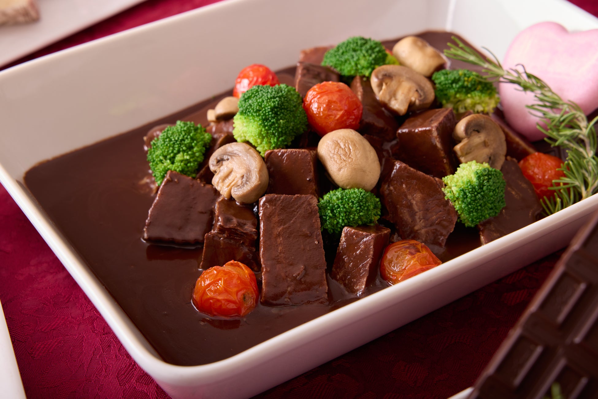 バレンタイン限定の特別なラインナップには、チョコレートの甘さと塩味やピリッとしたスパイシーなアクセントが絶妙にマッチするユニークなお料理を取り揃えました。ビーフシチューにカカオとチョコレートを加えた奥深い味わいや、ブルーベリーとバルサミコ酢、チョコレートの相性が際立つ一皿などバラエティ豊かにご用意。また、苺やバナナ、マシュマロなどチョコレートとの定番の組み合わせが楽しめるスイーツも登場します。大切な人とのひとときや自分へのご褒美として、一味違うバレンタインの美食体験をご堪能ください。
