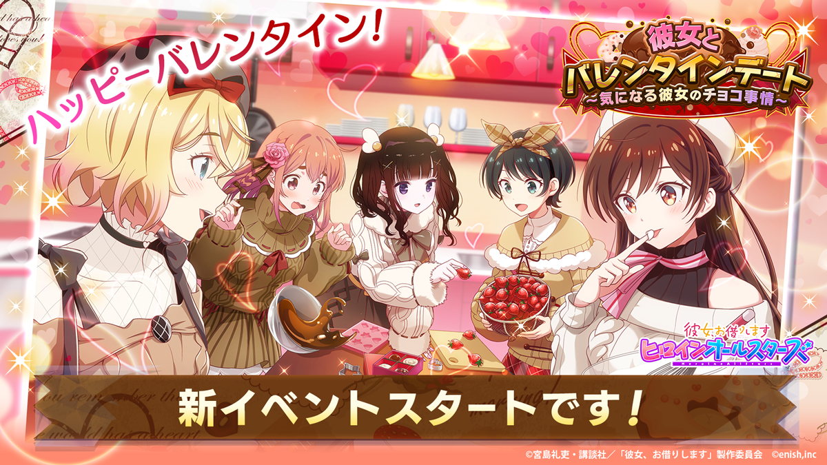 株式会社enish(本社:東京都港区、代表取締役社長:安徳 孝平、以下enish)は、2022年2月2日(水)より、アニメ「彼女、お借りします」初のゲームアプリ「彼女、お借りします ヒロインオールスターズ」にてゲームオリジナルストーリーをフルボイスでお楽しみいただける新イベント「彼女とバレンタインデート ~気になる彼女のチョコ事情~」を開催いたします。