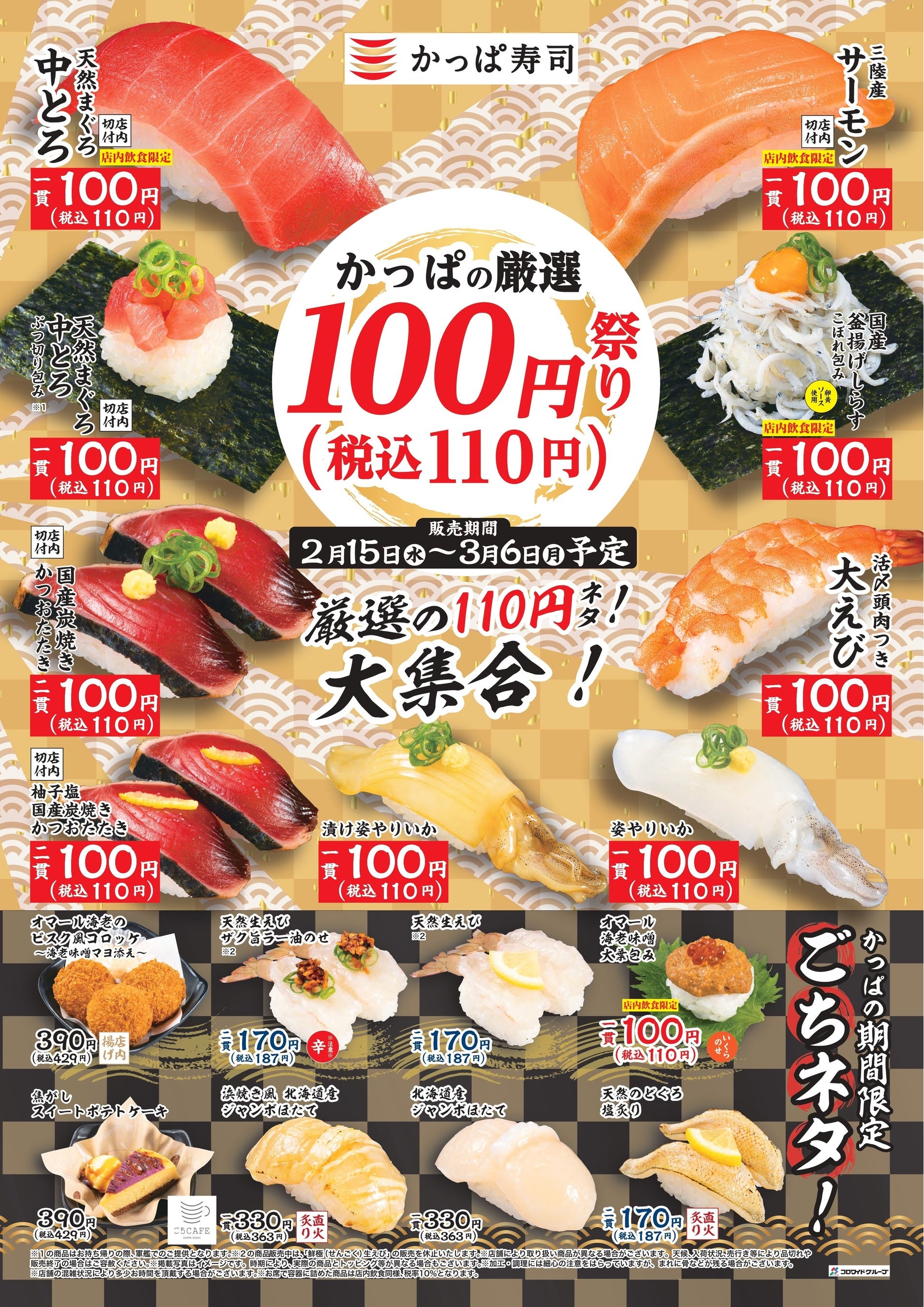 コロワイドグループのかっぱ寿司(カッパ・クリエイト㈱ 本社:神奈川県横浜市)は、2023年 2月 15 日(水)~3月 6 日(月)の期間『かっぱの厳選100円(税込110円)祭り』を、かっぱ寿司全店にて開催いたします。また、同期間にて『かっぱの期間限定ごちネタ!』も開催いたします。
