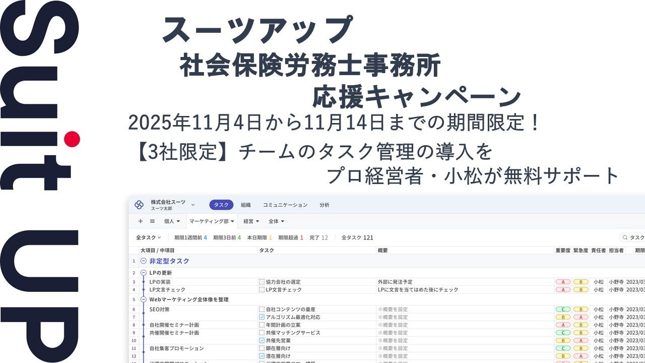 2025年11月4日から11月14日までの期間に、スーツアップの無料お試しにお申込みいただきました社会保険労務士事務所でチームのタスク管理を導入する予定の事務所のうち3事務所限定で、当社代表者であり中小・中堅企業やスタートアップのバリューアップに実績のあるプロ経営者の小松自ら、チームのタスク管理の導入サポートを無料で行うキャンペーンを実施します。