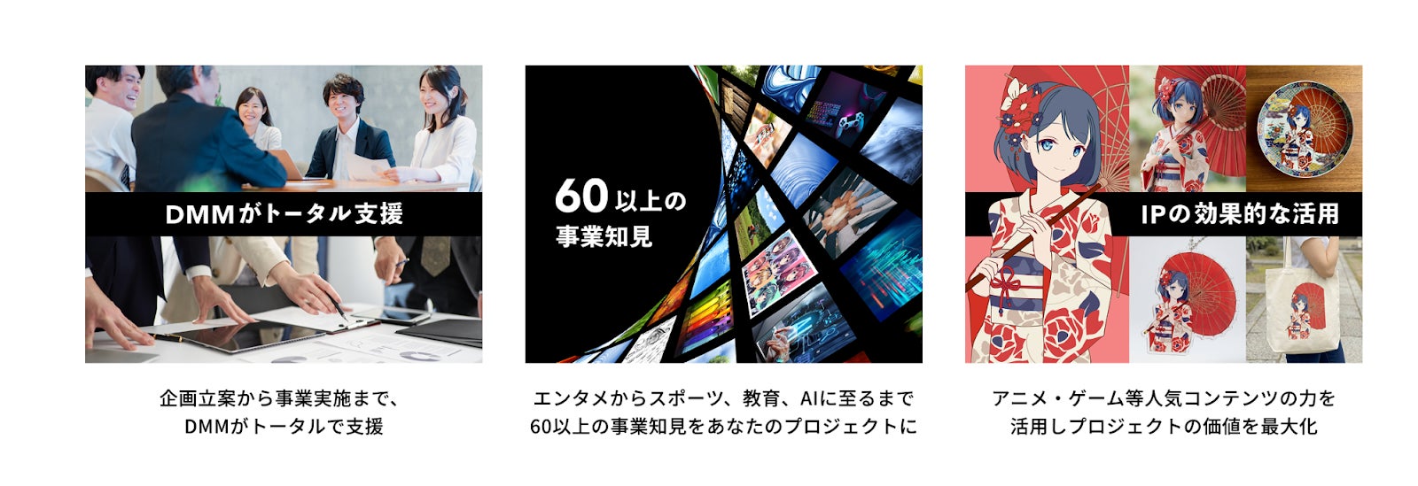DMM.comが持つ多様なIP(知的財産)を地域資源と掛け合わせ、新たな付加価値を創出します。