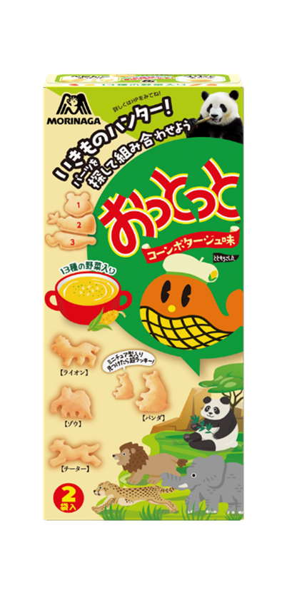 「おっとっと<コーンポタージュ味>」は、陸の生き物の菓子型が30種類入っており、13種類の野菜を使用した小さなお子さまでも楽しめる優しい「コーンポタージュ」味の「おっとっと」です。また、定番である「おっとっと<うすしお味>」は4月上旬から、海の生き物の新しい組み合わせ型、ミニチュア型が加わり、38種類の菓子型をお楽しみいただけます。