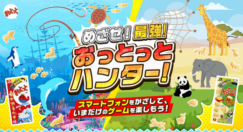 「めざせ!最強!おっとっとハンター」はスマートフォンで特設サイト内の専用カメラからお菓子の形を読み取ると、生き物をゲットできる期間限定のゲームが楽しめるブラウザコンテンツです。
