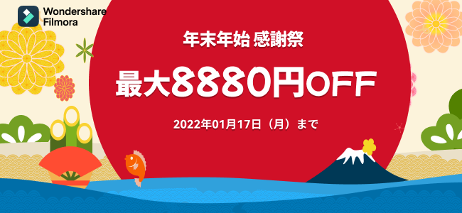 世界150か国以上で利用されるソフトウェアを手掛ける、株式会社ワンダーシェアーソフトウェア(東京都千代田区、代表:呉太兵)は、手軽にクオリティの高い動画が作れるPC向け動画編集ソフトWondershare Filmora(ワンダーシェアーフィモーラ)シリーズが、2021年12月28日(火)~2022年1月17日(月)まで、最大8,880円OFFになる年末年始感謝祭を実施いたします。