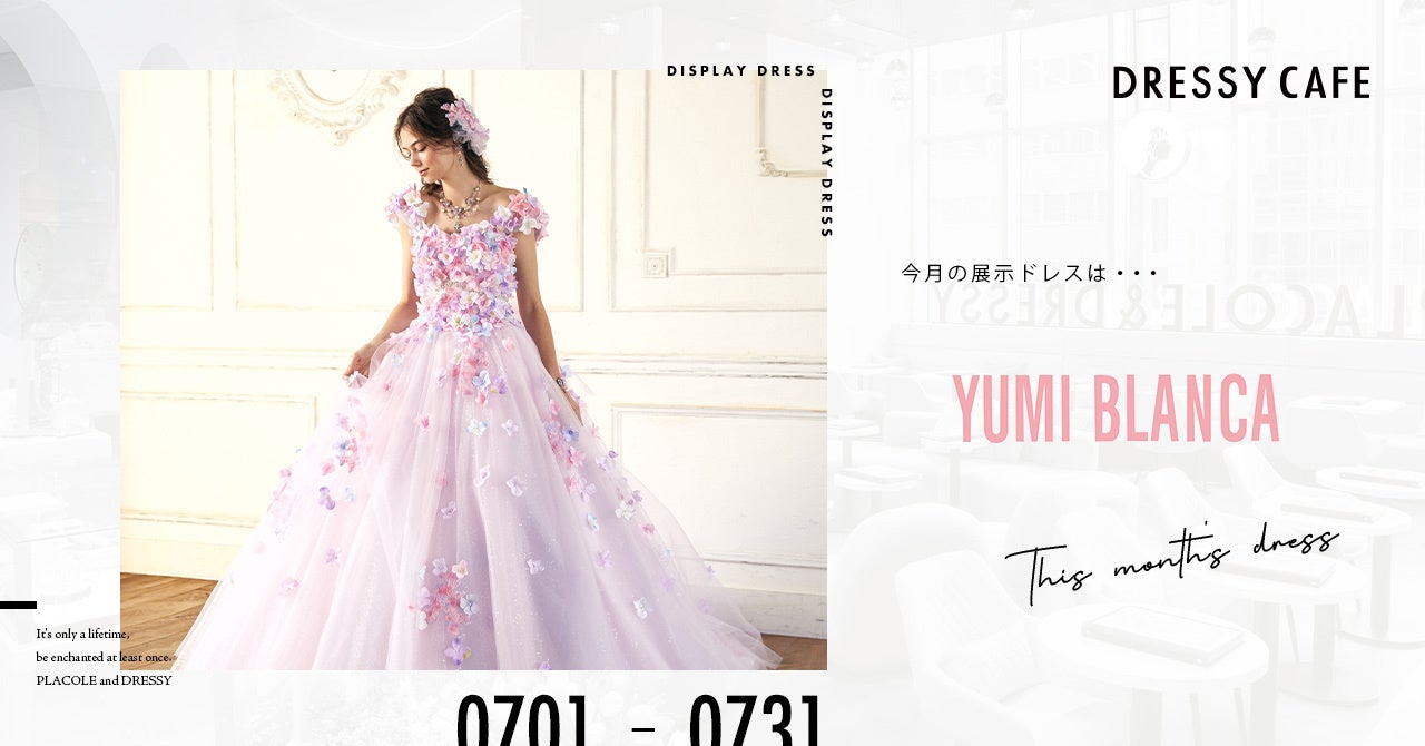 【DRESSYCAFE】7月のディスプレイドレスはYumiKatsuraのセカンドブランドである「YUMI BLANCA」のウェディングドレスを期間限定でお届けいたします。